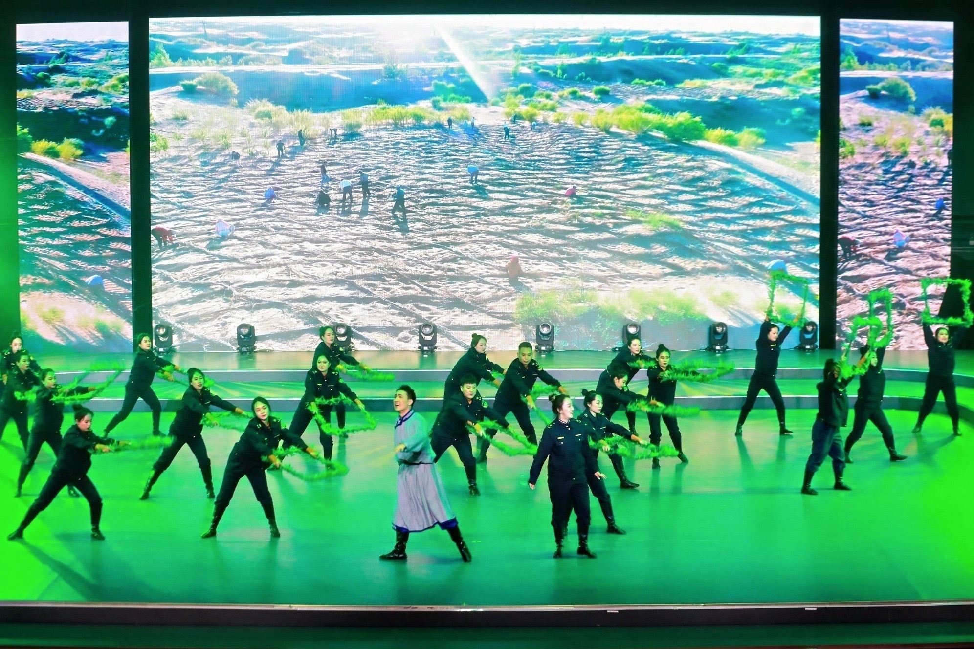 阿拉善分公司的參演作品《暖心的路》尤為引人注目。這部作品的創(chuàng)作靈感源自分公司職工在大漠戈壁中的日常工作。穿沙公路雖如巨龍穿越沙海,卻常被流沙覆蓋,維護(hù)之路充滿艱辛。正是在這樣的環(huán)境下,一代又一代的阿拉善人用草方格與風(fēng)沙抗?fàn)?,守護(hù)著這片土地的綠色希望。阿拉善分公司三分之二的基層單位扎根于戈壁深處,職工們常年與風(fēng)沙為伴,在公路沿線植綠護(hù)綠,用汗水和堅(jiān)持守護(hù)著家園,點(diǎn)亮了希望之路?!杜牡穆贰穼荷场⒆o(hù)路等工作場(chǎng)景藝術(shù)化地呈現(xiàn)于舞臺(tái)之上,當(dāng)“草方格編織綠色希望”的畫面映入觀眾眼簾時(shí),引發(fā)了強(qiáng)烈的共鳴,現(xiàn)場(chǎng)掌聲雷動(dòng)。