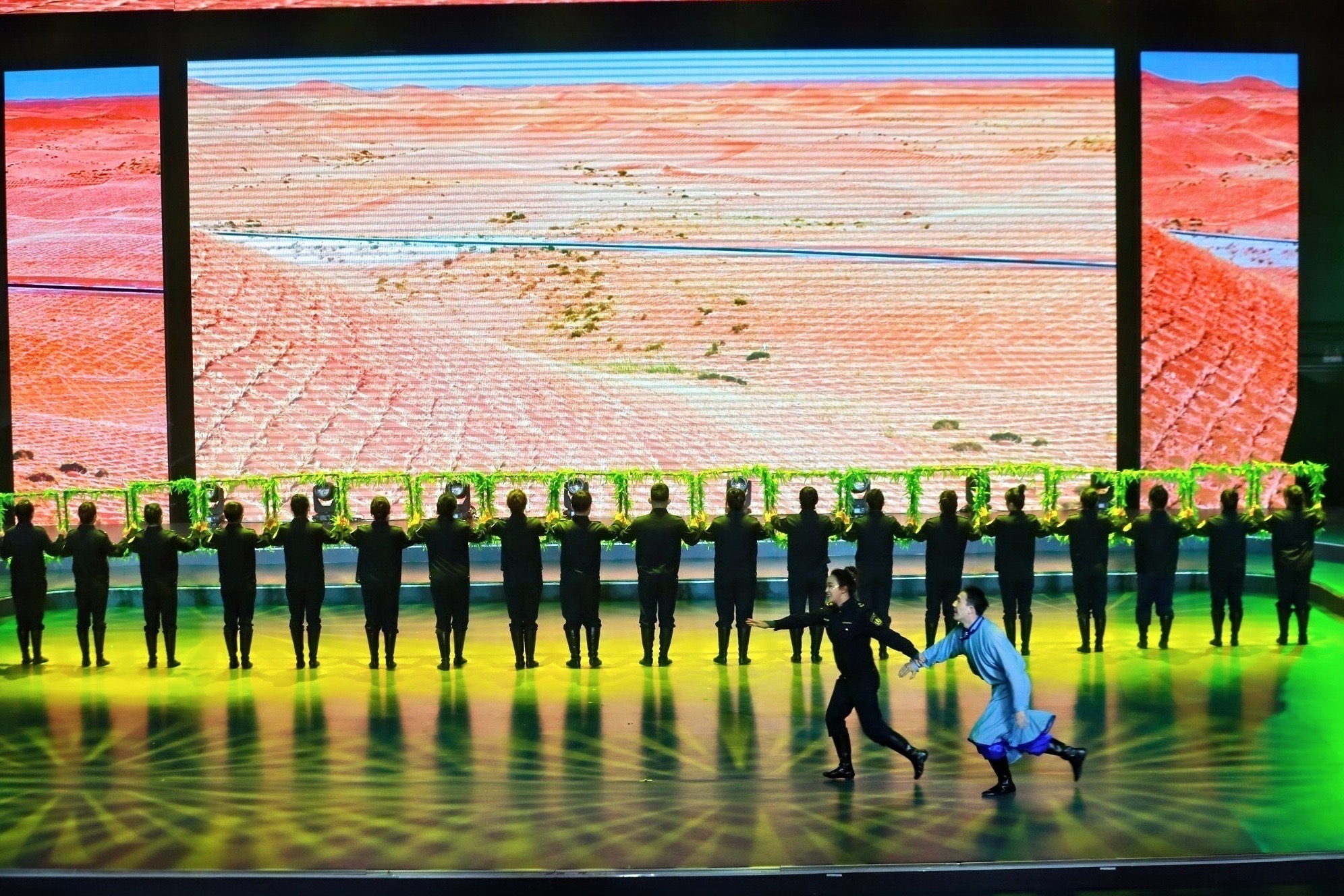 演出以《我們都是追夢(mèng)人》開場(chǎng)舞點(diǎn)燃全場(chǎng),分《薪火相傳·瀚海丹心》《同心筑夢(mèng)·錦繡家園》《奮勇爭(zhēng)先·再啟新程》三個(gè)篇章,通過(guò)舞蹈、歌曲、小品等形式,展現(xiàn)阿拉善職工的昂揚(yáng)風(fēng)貌。