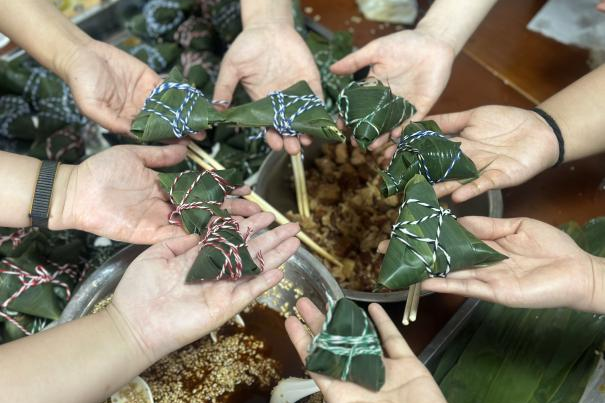 活動(dòng)現(xiàn)場(chǎng),廚師準(zhǔn)備好糯米、粽葉、繩子等包粽材料,大家圍坐捋葉、填米、扎繩,巧手翻飛間歡聲笑語(yǔ)不斷,在互教互學(xué)中感受傳統(tǒng)美食魅力;隨后的香囊制作環(huán)節(jié),工作人員發(fā)放彩繩、香囊模板與材料包,眾人邊交流技巧邊編織縫制,讓彩繩在指尖穿梭纏繞,將祈福納祥的心愿與對(duì)親友的祝福融入一針一線,制成造型各異的吉祥香囊;最后,端午知識(shí)競(jìng)答環(huán)節(jié)以20道圍繞節(jié)日起源、習(xí)俗、詩(shī)詞的題目開(kāi)展搶答,大家踴躍作答,在輕松互動(dòng)中重溫文化典故,深化對(duì)端午傳統(tǒng)文化的認(rèn)知。