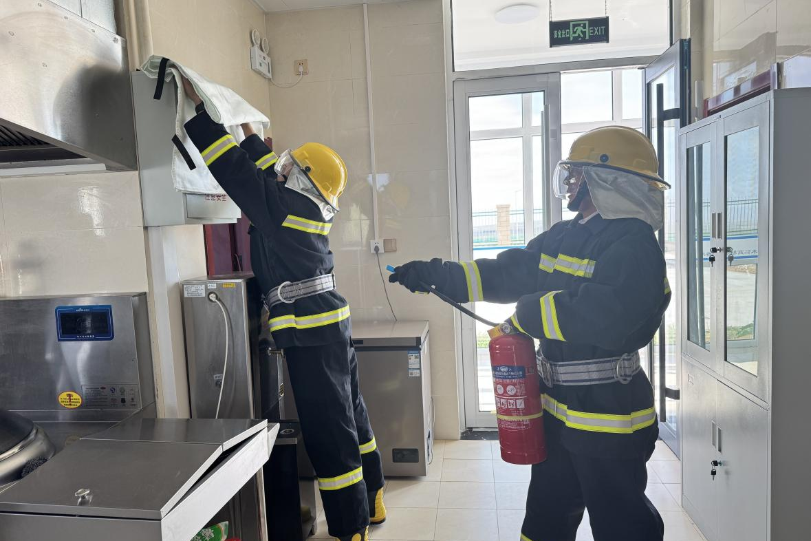 在此次演練中,木仁高勒收費站以演練模擬廚房配電箱線短路引發(fā)火情為背景,共設置火災初期撲救、人員疏散逃離兩個階段。值班所長接到廚房火災信息后,立即啟動火災現(xiàn)場處置方案通過對講機告知應急小組成員,相關人員第一時間切斷電源,并到微型消防站穿戴裝備前往火源點嘗試初期滅火,后因火勢過大,需對人員進行疏散,所站全員3分鐘內完成疏散,在較短時間內成功處置。