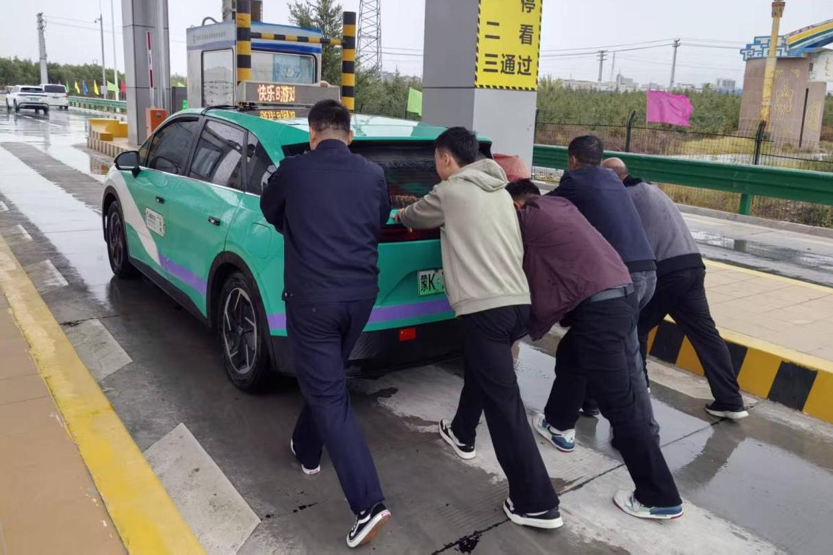 同日下午,一輛蒙k牌照的新能源車行駛至巴彥浩特南收費(fèi)站因電量不足滯留收費(fèi)車道。正值小雨天氣,加之雙節(jié)期間車流量較大,工作人員發(fā)現(xiàn)該情況后上報(bào)帶班所長(zhǎng)。帶班所長(zhǎng)迅速組織人員分頭行動(dòng),一隊(duì)對(duì)后方車輛進(jìn)行疏導(dǎo);另一隊(duì)冒雨推車至安全地帶。經(jīng)過二十分鐘的緊急處置,成功將故障車輛推至收費(fèi)所就近充電點(diǎn),成功解除難題。