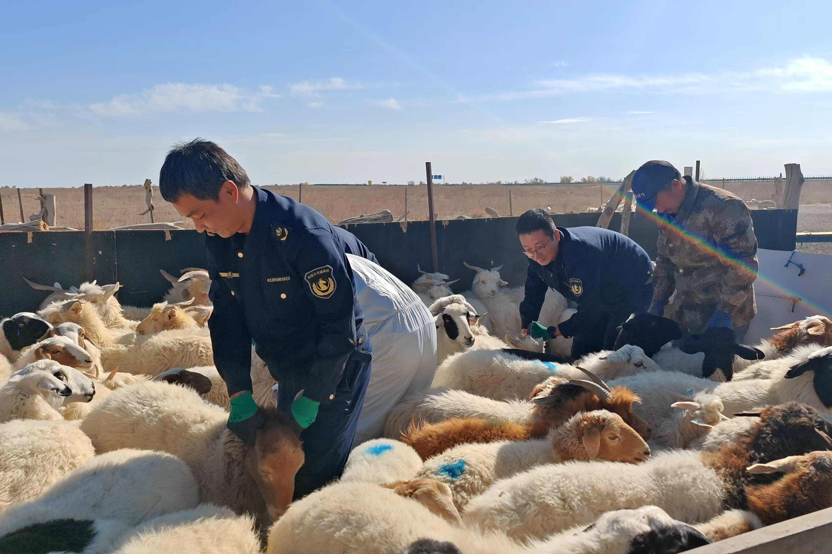 經(jīng)了解,因羊群數(shù)量較大,老人無法獨(dú)自協(xié)助防疫站工作人員完成疫苗接種工作,第一時(shí)間向達(dá)來呼布路網(wǎng)監(jiān)測(cè)中心黨支部發(fā)出了求助信號(hào)。面對(duì)牧民的迫切需求,黨支部迅速響應(yīng),組織黨員志愿服務(wù)隊(duì)驅(qū)車前往烏蘭格日勒嘎查牧民巴塔家中,協(xié)助老人及防疫站工作人員共同開展羊群注射疫苗工作。