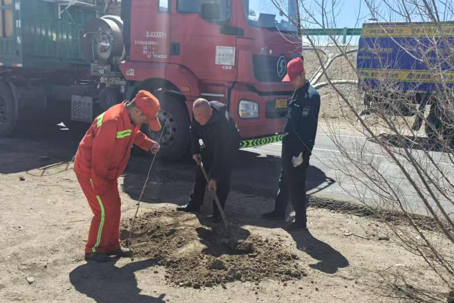 活動當日,在崗職工們攜帶鐵鍬、水桶等栽種工具,迅速集結于服務區(qū)車棚綠化帶栽種點,分工協(xié)作,有序完成挖坑、栽苗、澆水等工作。經過2天的辛勤勞作,100余株胡楊樹苗在服務區(qū)綠化帶兩側扎根,服務區(qū)綠植覆蓋面積增至2000多平方米。