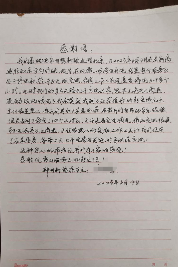 此次應(yīng)急處置中,風(fēng)雷山服務(wù)區(qū)憑借高效有序的應(yīng)對(duì)舉措,贏得了車主們的廣泛贊譽(yù)。返京車主吳先生特意手寫感謝信以表謝意,更有眾多車主自發(fā)通過社交平臺(tái)分享經(jīng)歷,用生動(dòng)的文字與畫面,點(diǎn)贊服務(wù)區(qū)在突發(fā)狀況下的人性化服務(wù)。這些來自車主們最直接、最真實(shí)的反饋,不僅是對(duì)服務(wù)區(qū)快速響應(yīng)、妥善處理突發(fā)事件能力的認(rèn)可,更充分彰顯出其在關(guān)鍵時(shí)刻,堅(jiān)守責(zé)任擔(dān)當(dāng)、保障公眾出行體驗(yàn)的卓越應(yīng)急保障能力。