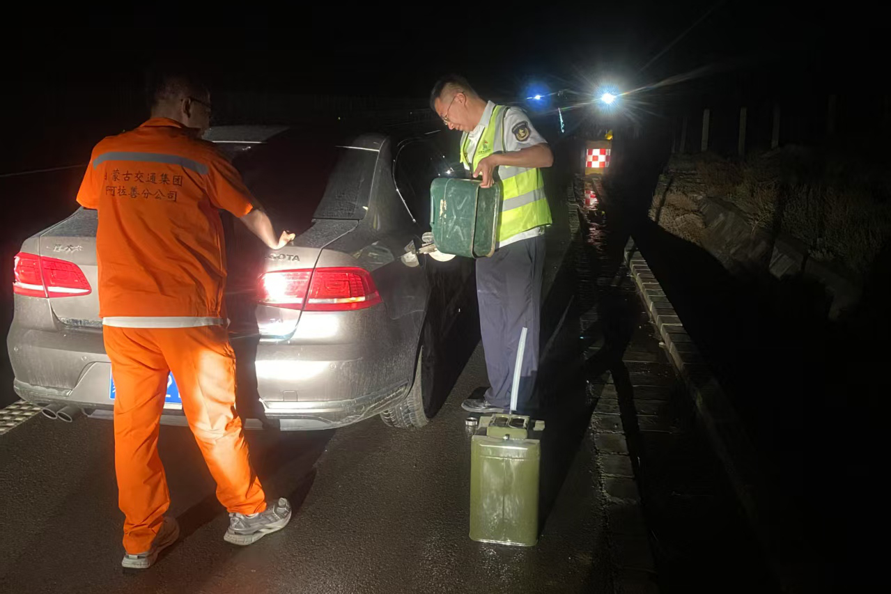 在了解情況后,養(yǎng)護(hù)監(jiān)管員立即擺放三腳架確保安全,并與巴彥浩特北收費(fèi)所工作人員聯(lián)系尋求支援。隨后,收費(fèi)所工作人員冒雨趕往事發(fā)現(xiàn)場(chǎng),與吳女士前往加油站購(gòu)買汽油。待車輛補(bǔ)充燃油后發(fā)現(xiàn)因電池虧電仍然無(wú)法啟動(dòng),工作人員使用搭車線成功搭電。車輛順利啟動(dòng)后,受困司乘人員對(duì)工作人員表示感激。