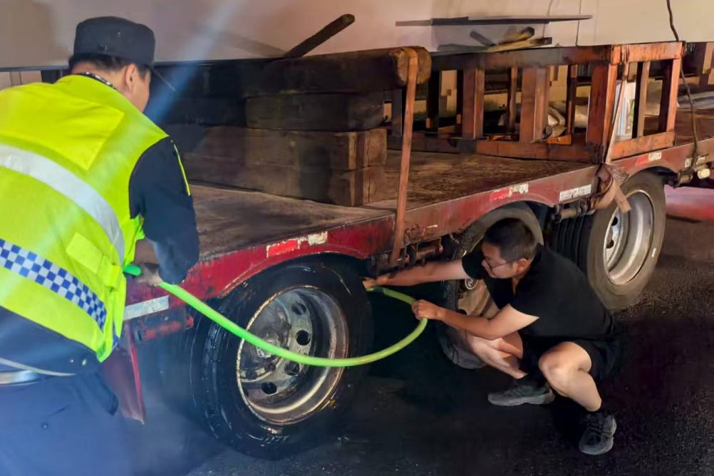 8月14日22時10分許,敖干德力格收費所上演緊急救援。一輛貨六型六軸車繳費時,收費所工作人員發(fā)現(xiàn)車輛后輪起火,立即示警并上報情況。?