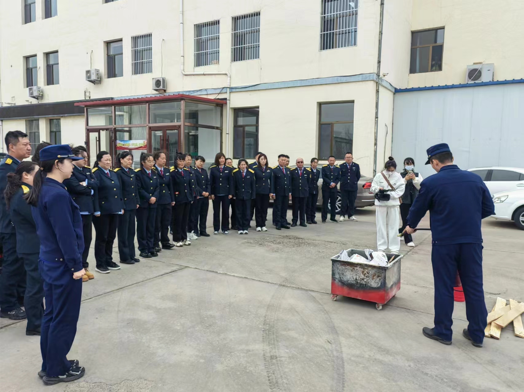活動最后由唐教官為大家現(xiàn)場講解消防器材的正確使用、常見火災(zāi)的撲滅、火場逃生等方面知識,并在用電、用火上給予科學(xué)的指導(dǎo),全面提高職工應(yīng)對火災(zāi)的能力,使全體職工深刻認(rèn)識到火災(zāi)的危害性和預(yù)防的重要性;模擬演練三樓會議室著火,隨著演練口令下達(dá),所有人員迅速進(jìn)入角色,后勤組在樓內(nèi)點燃發(fā)煙餅,模擬辦公樓內(nèi)發(fā)生火災(zāi),引起滾滾濃煙,接著在安全領(lǐng)導(dǎo)小組的指導(dǎo)下,按照疏散路線有序的撤離辦公樓,撤離過程中用濕巾捂住口鼻,彎腰快速的從各個場所奔向室外指定的安全地帶,整個撤離過程快速、安全、有序。