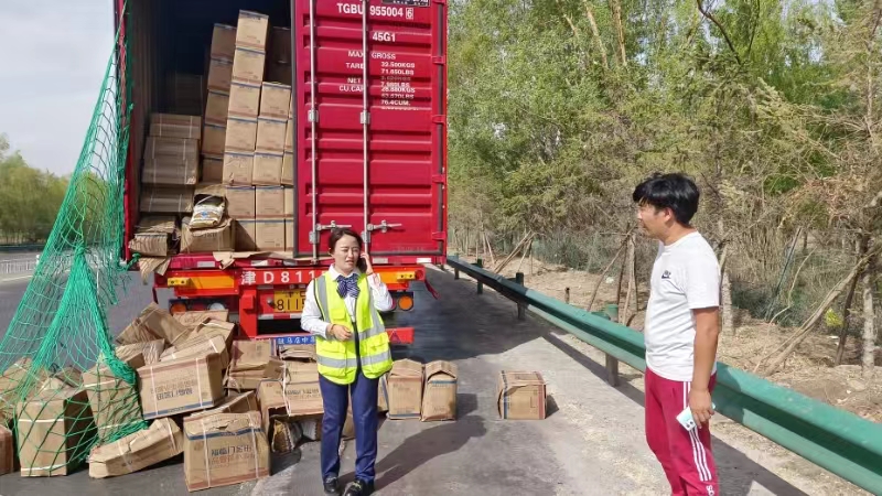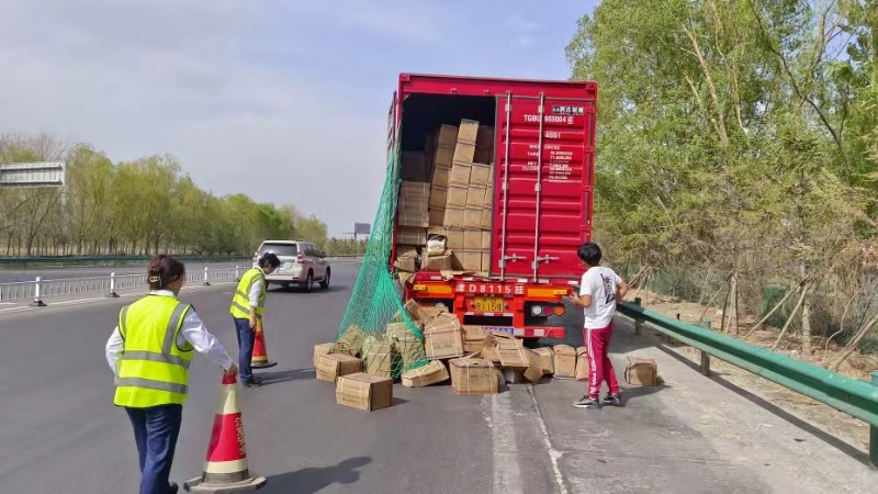 “師傅,快停車,貨物都漏啦!”5月9日下午16時(shí)許,一輛津C牌照的半掛車從臨河?xùn)|高速收費(fèi)所駛?cè)?,?xì)心的收費(fèi)員張晶發(fā)現(xiàn)車身剛出車道,尾部的車廂門便被堆積的貨物沖擠開,伴隨著車輛停車瞬間還傾瀉而下許多箱子,司機(jī)渾然不覺。