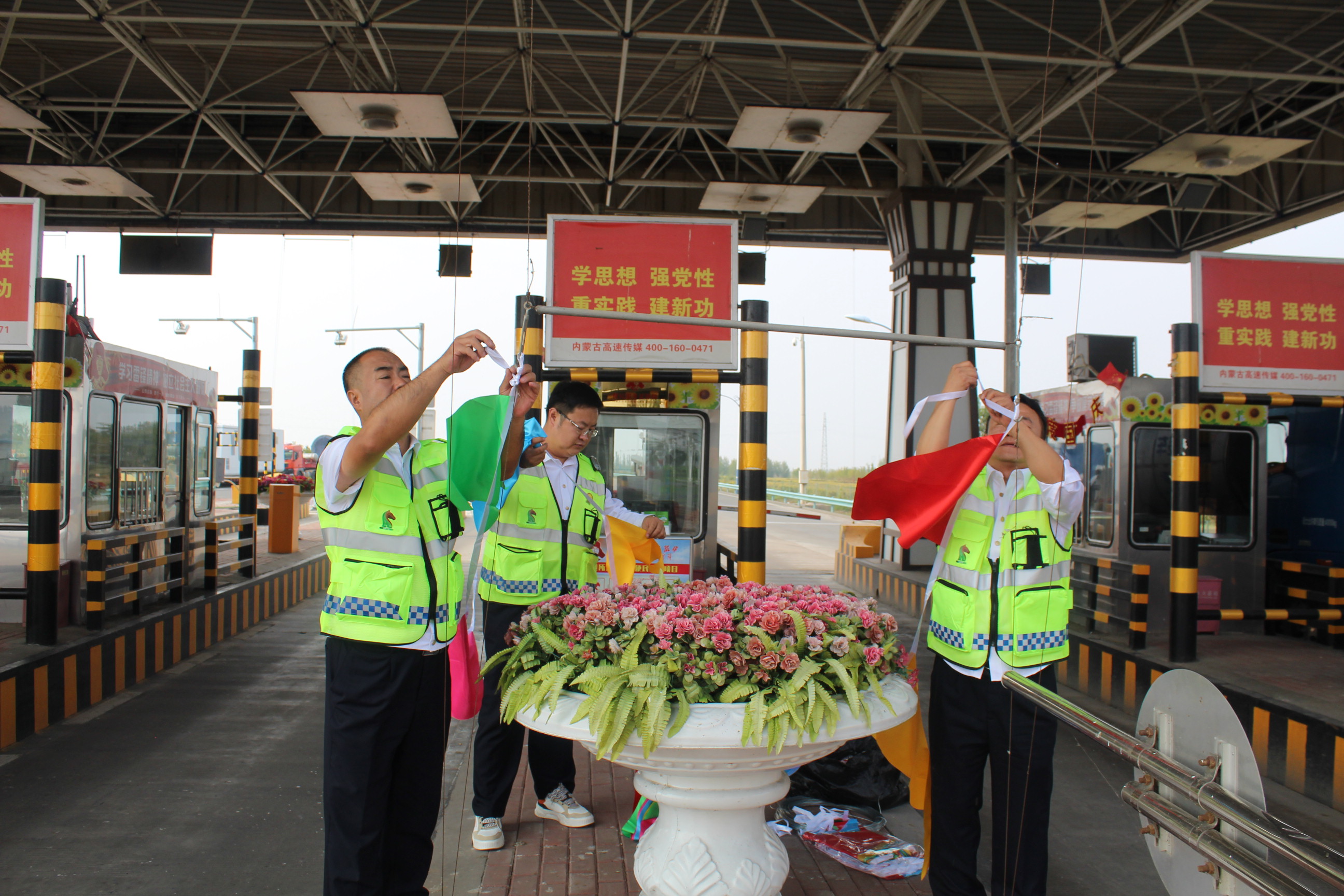 收費廣場懸掛國旗。在微風中,五星紅旗迎風飄揚,成為了一道亮麗的風景線。那一抹抹鮮艷的紅色,不僅表達了對祖國的熱愛和祝福,也讓過往的司乘人員感受到了濃厚的節(jié)日氛圍。