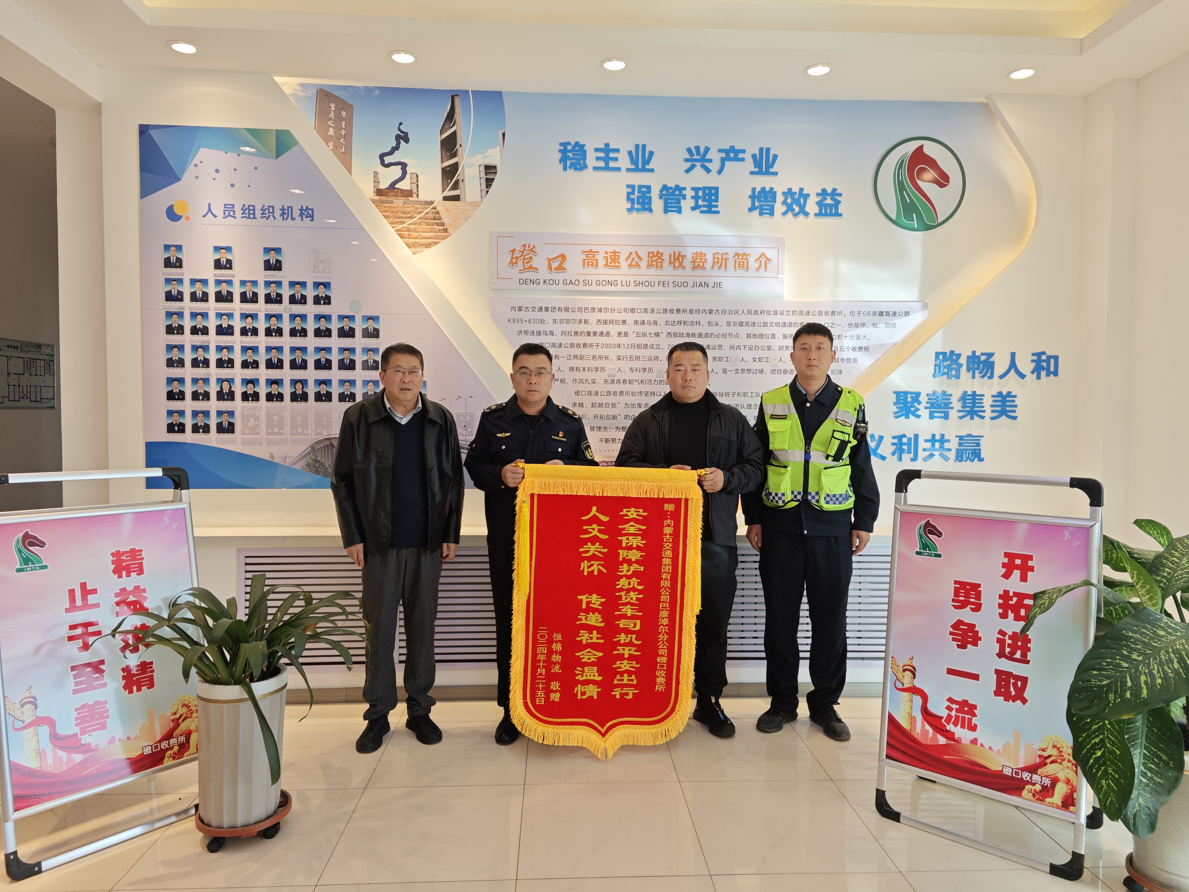 2024年10月25日,一面鮮艷的錦旗被送到了內(nèi)蒙古交通集團(tuán)有限公司巴彥淖爾分公司磴口高速公路收費(fèi)所。這面錦旗來自烏海市物流企業(yè)恒錦物流,小小錦旗承載著地方企業(yè)對(duì)磴口高速公路收費(fèi)所的深深感激之情。