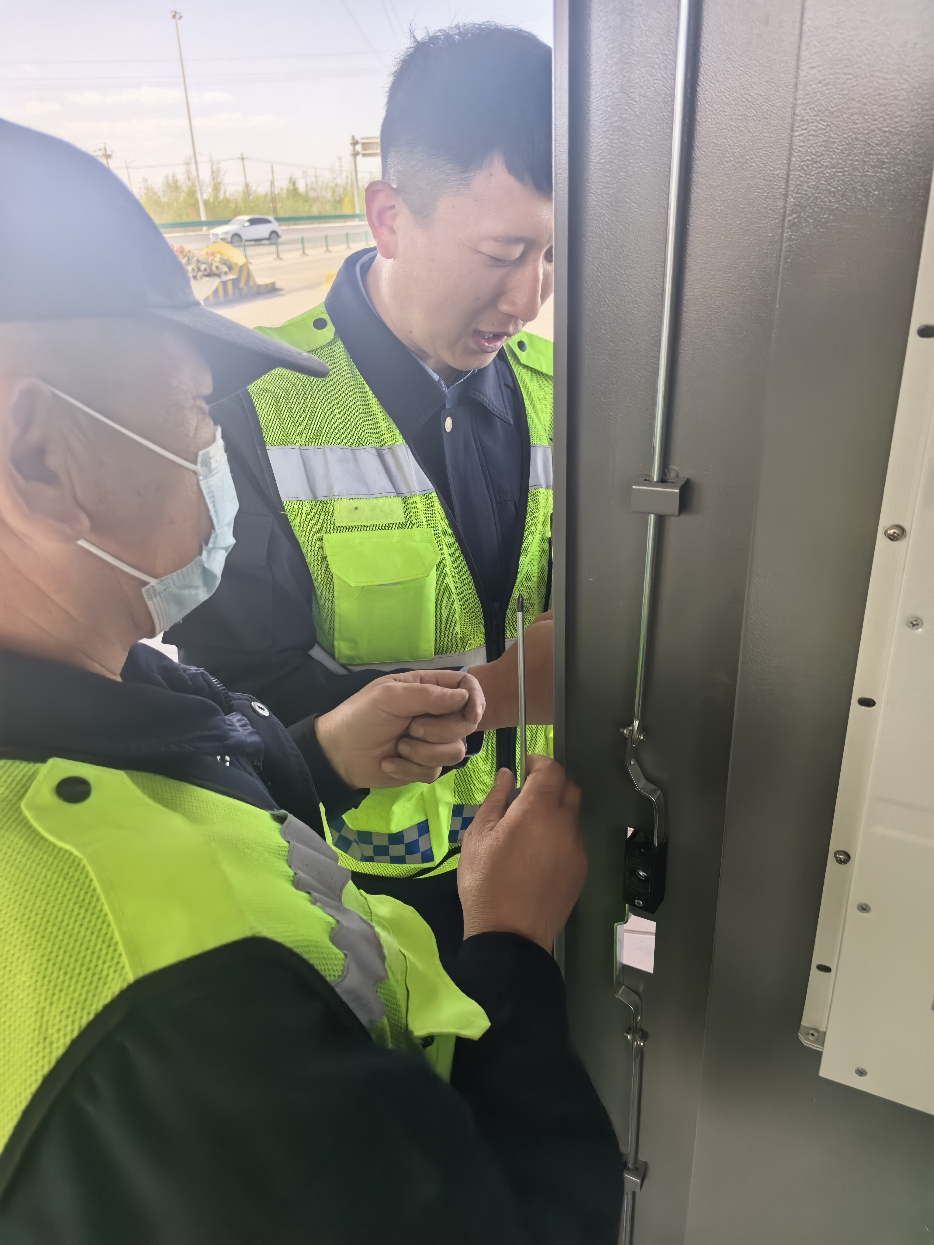 5月8日早班期間,磴口高速公路收費所收費班長彭佳東在檢查設備時,發(fā)現(xiàn)車道機器人門鎖芯損壞。如不盡快修復,可能造成通行卡丟失或設備故障。此時正值車流高峰,車道機器人必須保持高效運轉才能確保車流通行順暢。面對突發(fā)故障,他立即化身“維修專員”,憑借豐富的工作經驗與專業(yè)技能,迅速開展自主維修。