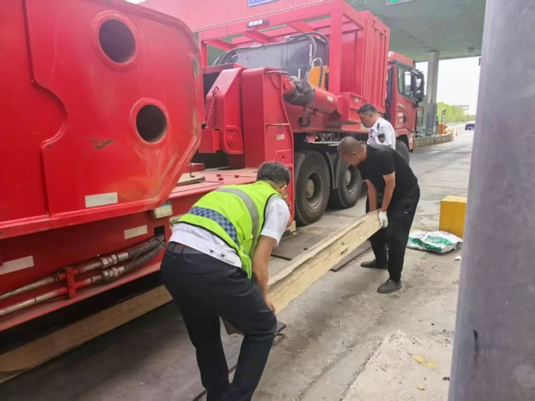 此時,值班所長王星了解到車輛通行中的潛在困難。他第一時間組織收費(fèi)站工作人員啟動應(yīng)急保障預(yù)案,帶領(lǐng)團(tuán)隊分工協(xié)作:有人引導(dǎo)車輛精準(zhǔn)??恐林付▍^(qū)域,有人協(xié)助駕駛員搬運(yùn)并安裝便攜工具,還有人同步核查運(yùn)輸證件、協(xié)調(diào)車道調(diào)度,確保其他車輛通行不受影響。在烈日下,工作人員們熟練配合,僅用20分鐘便完成了所有設(shè)備的安裝與調(diào)試,三輛大件運(yùn)輸車輛得以順利駛?cè)胧召M(fèi)站核心區(qū)域。