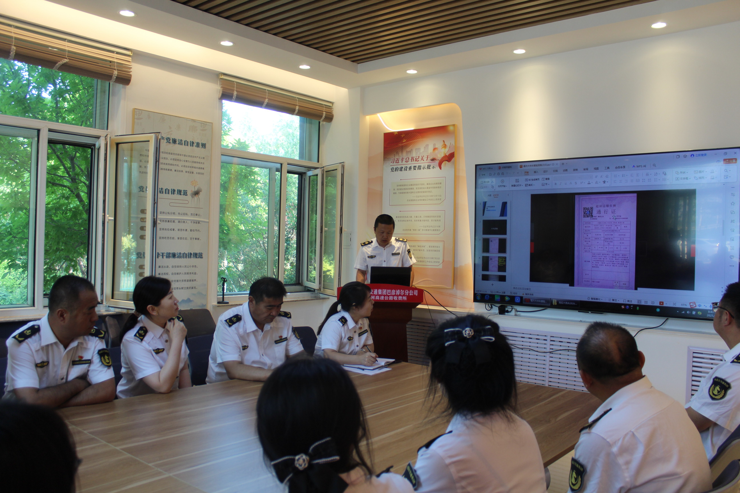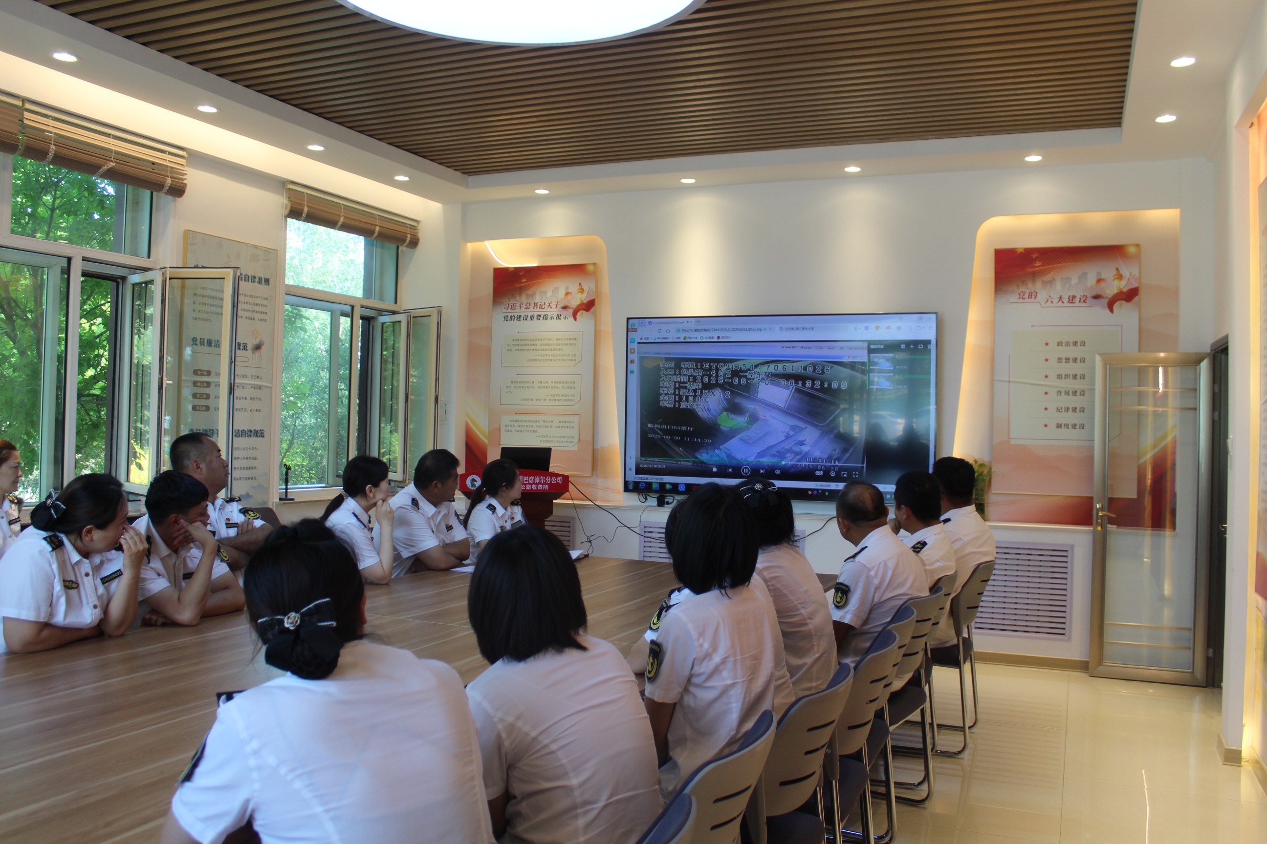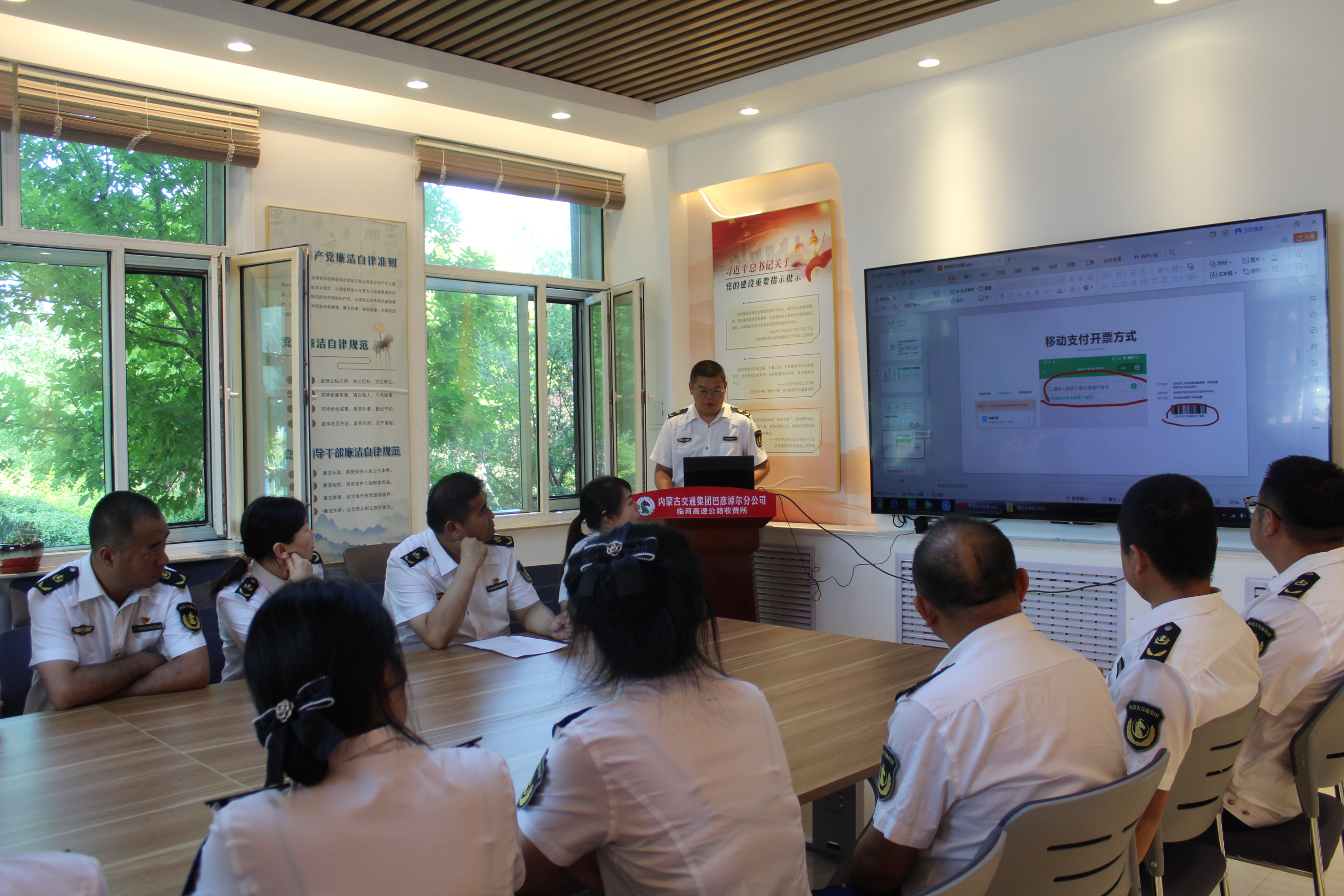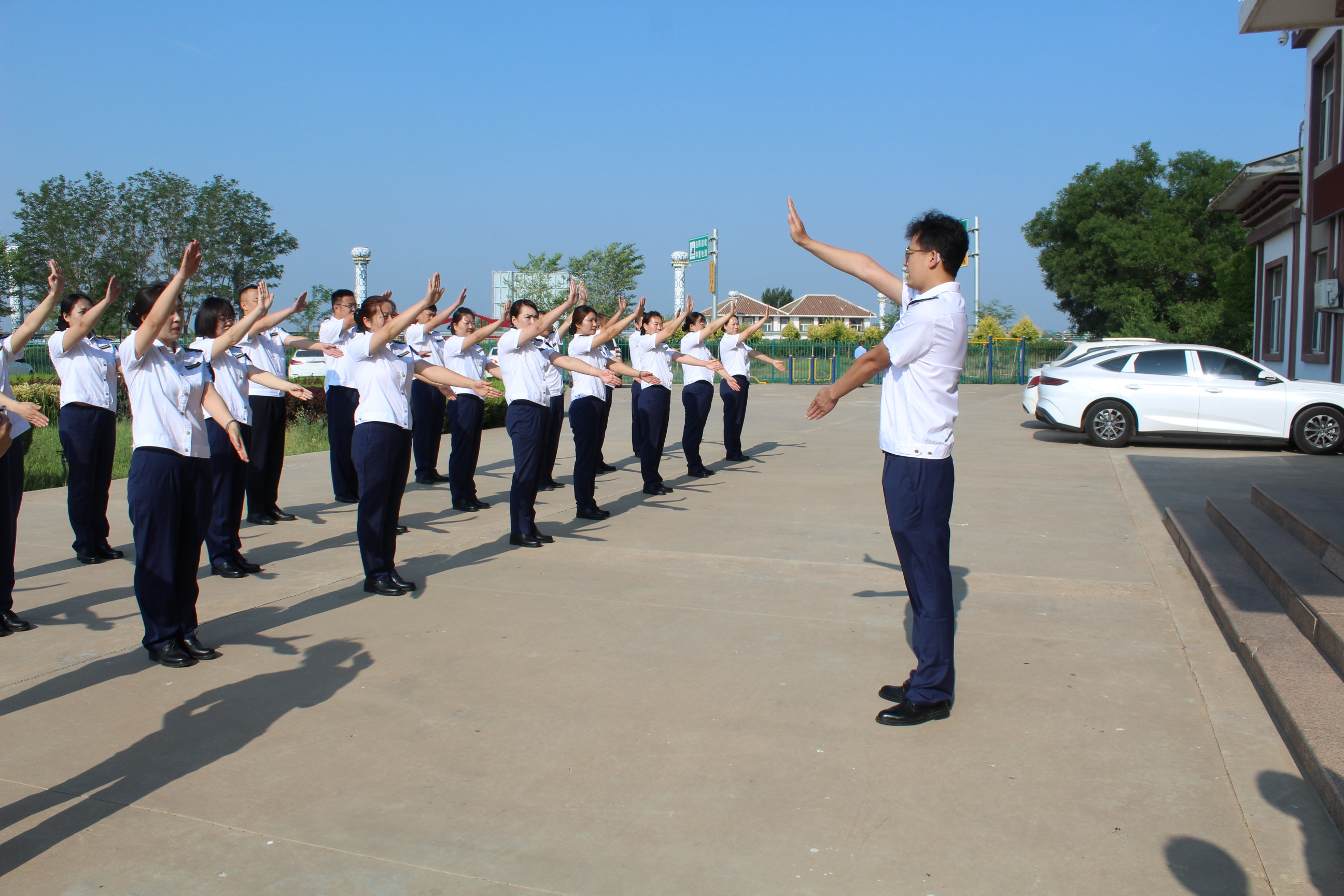 收費(fèi)三班全員著裝整齊、列隊(duì)完畢,從崗前準(zhǔn)備、崗前動(dòng)員、列隊(duì)上崗、班組交接等動(dòng)作,為全體人員展示每一個(gè)環(huán)節(jié)。收費(fèi)員們一遍遍的練習(xí)打磨,動(dòng)作也從不自信到標(biāo)準(zhǔn)逐漸到流暢,力求每一個(gè)動(dòng)作標(biāo)準(zhǔn)、規(guī)范,力爭(zhēng)培訓(xùn)有效果,并能運(yùn)用到日常收費(fèi)工作中去。