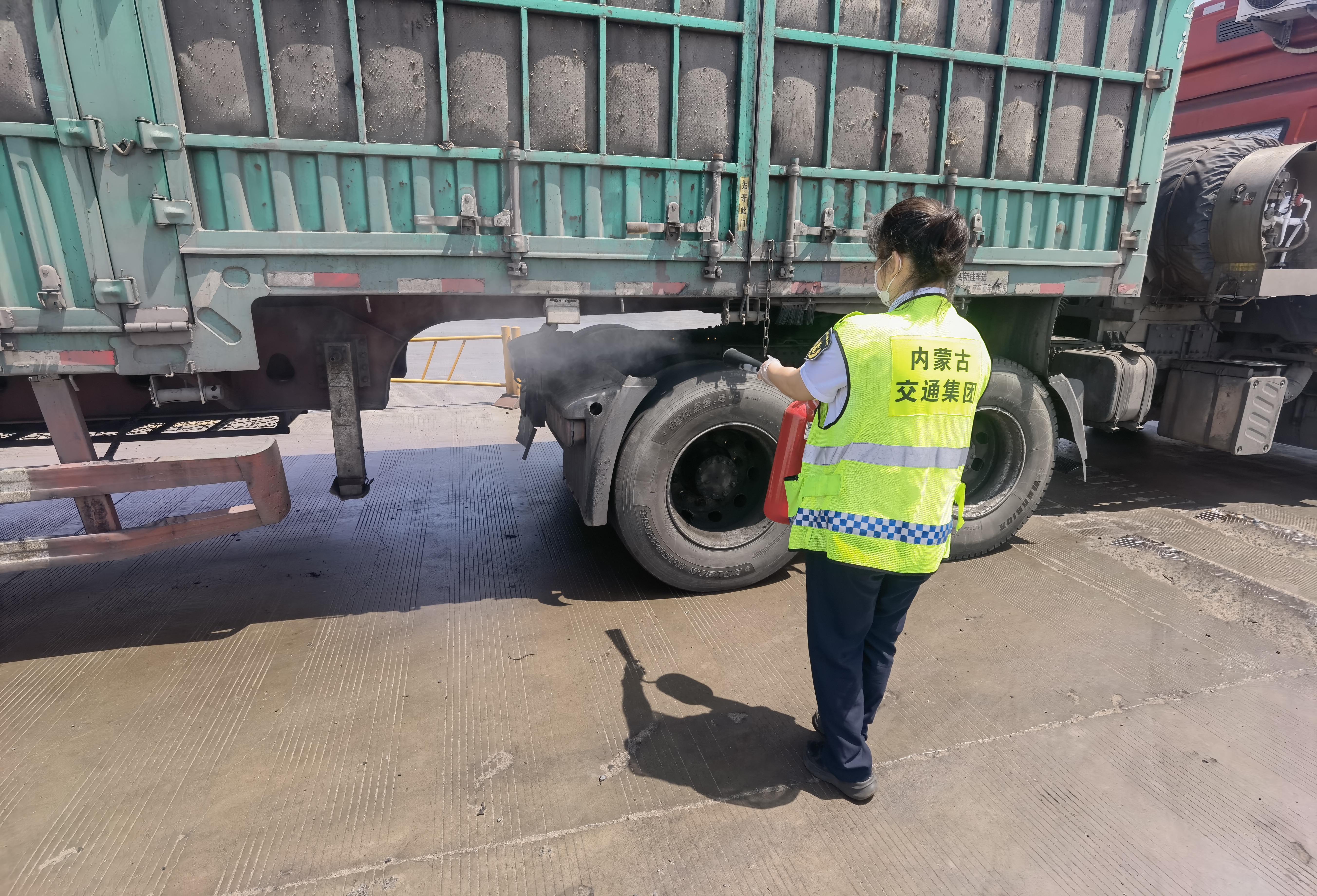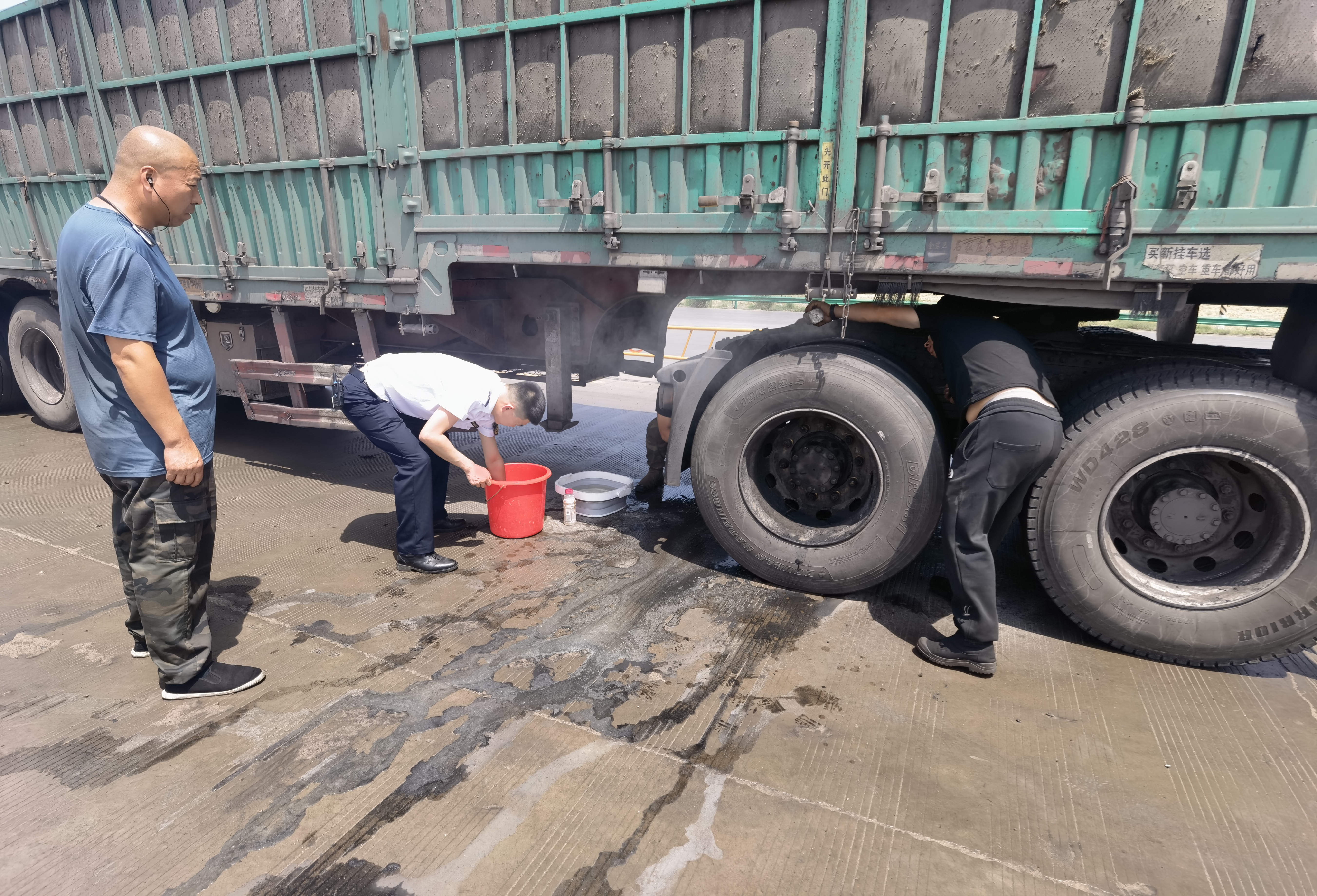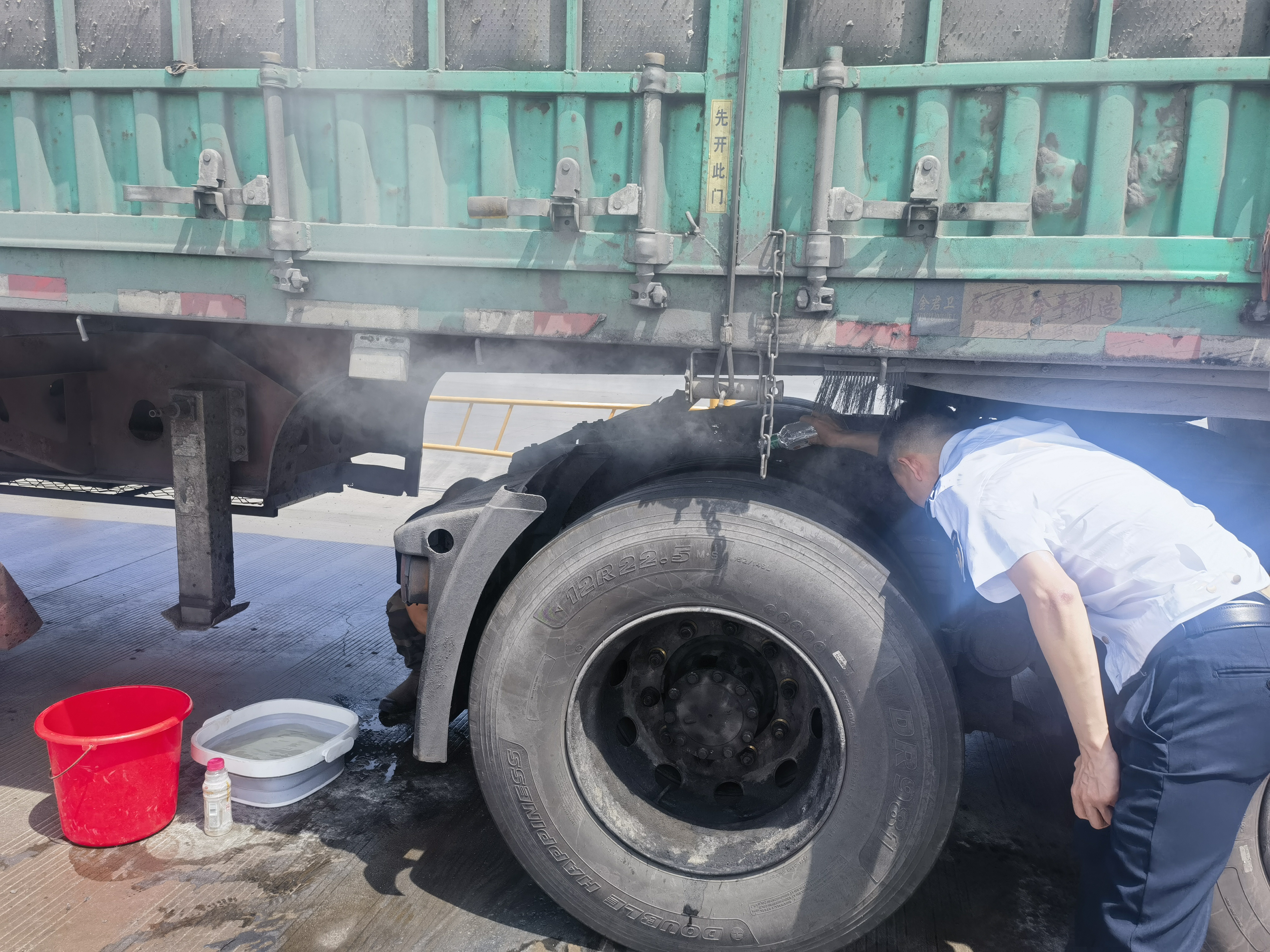 6月29日下午2點(diǎn)左右,一輛六軸貨車(chē)駛?cè)肭斑_(dá)門(mén)收費(fèi)所廣場(chǎng)時(shí)突發(fā)火情。收費(fèi)人員在遠(yuǎn)處發(fā)現(xiàn)車(chē)身側(cè)面濃煙滾滾,第一時(shí)間上報(bào)監(jiān)控并攔停該貨車(chē),隨后迅速啟動(dòng)防滅火應(yīng)急預(yù)案。當(dāng)班收費(fèi)班長(zhǎng)及收費(fèi)人員手持滅火器對(duì)準(zhǔn)著火輪胎根部噴射干粉,壓制火勢(shì)。火被撲滅后,為防止輪胎因高溫變形或復(fù)燃,工作人員用水澆灑著火輪胎進(jìn)行降溫。經(jīng)過(guò)約10分鐘緊張撲救,明火被徹底撲滅,現(xiàn)場(chǎng)彌漫著刺鼻的焦糊味,而工作人員的制服早已被汗水浸濕。