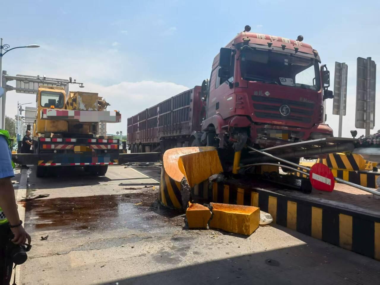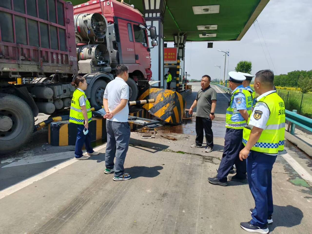 7月23日中午12:06,一輛六軸貨車駛?cè)肱R河高速公路收費所入口時,因夏季天氣炎熱,駕駛員中暑不慎撞向安全船島,車頭卡在船島上方。收費員迅速上報監(jiān)控,并對該車進行尾控,收費班長當(dāng)機立斷關(guān)閉車道信號燈,立馬上前查看車內(nèi)人員情況。