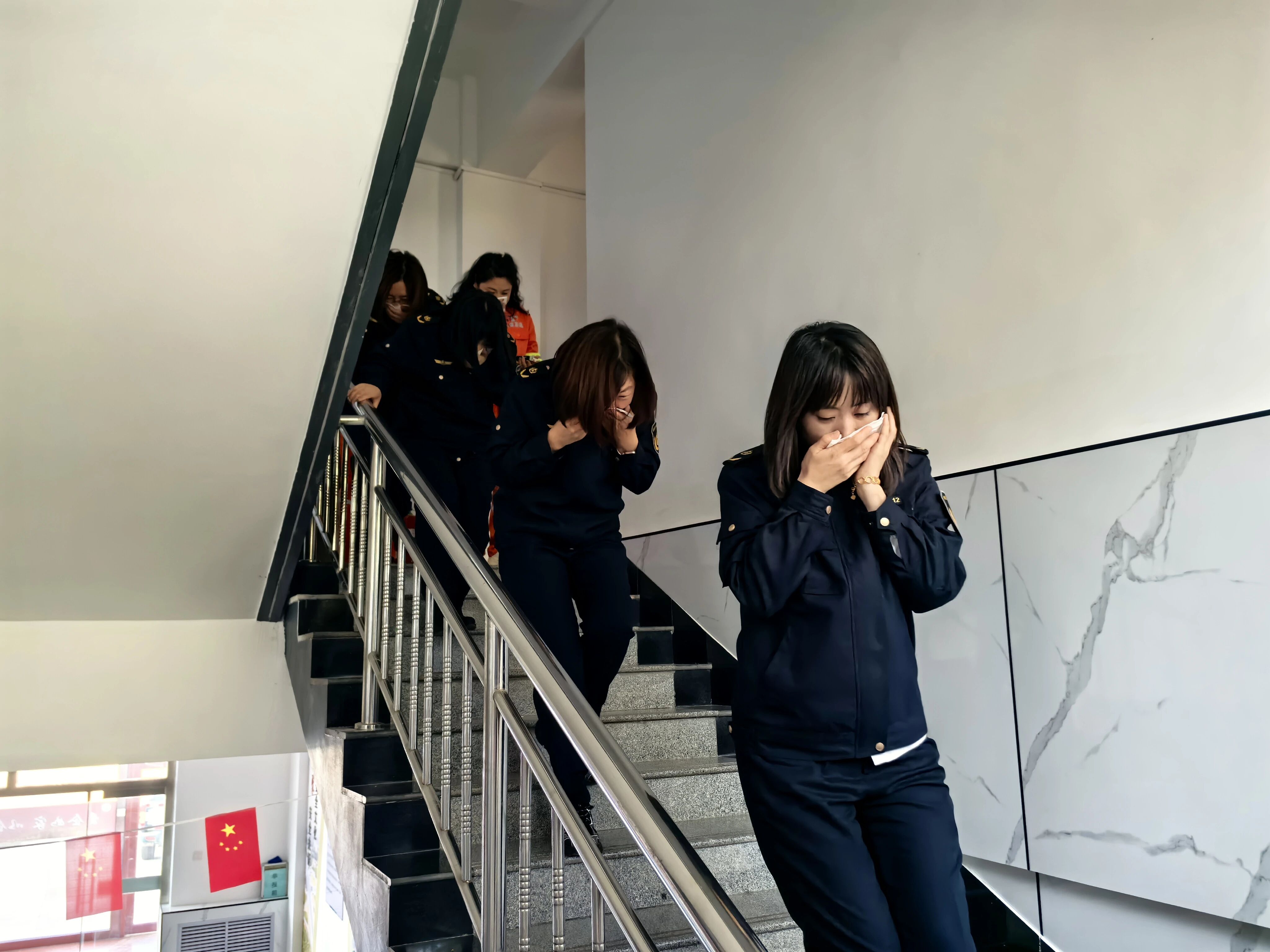 以“練”筑防,模擬強技能,演練模擬辦公樓因電路老化突發(fā)火情場景。警報拉響后,疏散引導(dǎo)組高舉指示牌、手持?jǐn)U音器,穿梭在各個角落,有條不紊地引導(dǎo)職工用濕毛巾捂住口鼻,沿安全通道快速撤離。整個過程分工明確、反應(yīng)迅速,各環(huán)節(jié)銜接流暢,高效完成從火情發(fā)現(xiàn)到處置的全流程演練。