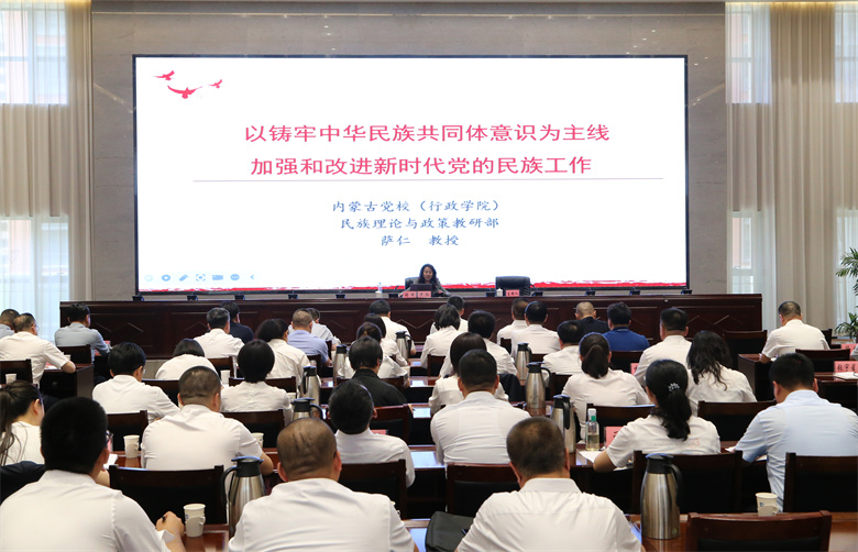 薩仁教授以《以鑄牢中華民族共同體意識為主線加強和改進(jìn)新時代黨的民族工作》為題,從鑄牢中華民族共同體意識的豐富內(nèi)涵、重要意義和實踐要求三個方面作了全面細(xì)致的講解,運用豐富生動的案例、旁征博引的論述幫助黨員干部、黨外代表人士更好領(lǐng)會和理解新時代黨的民族工作和民族理論政策、深入貫徹鑄牢中華民族共同體意識工作主線的重要意義。