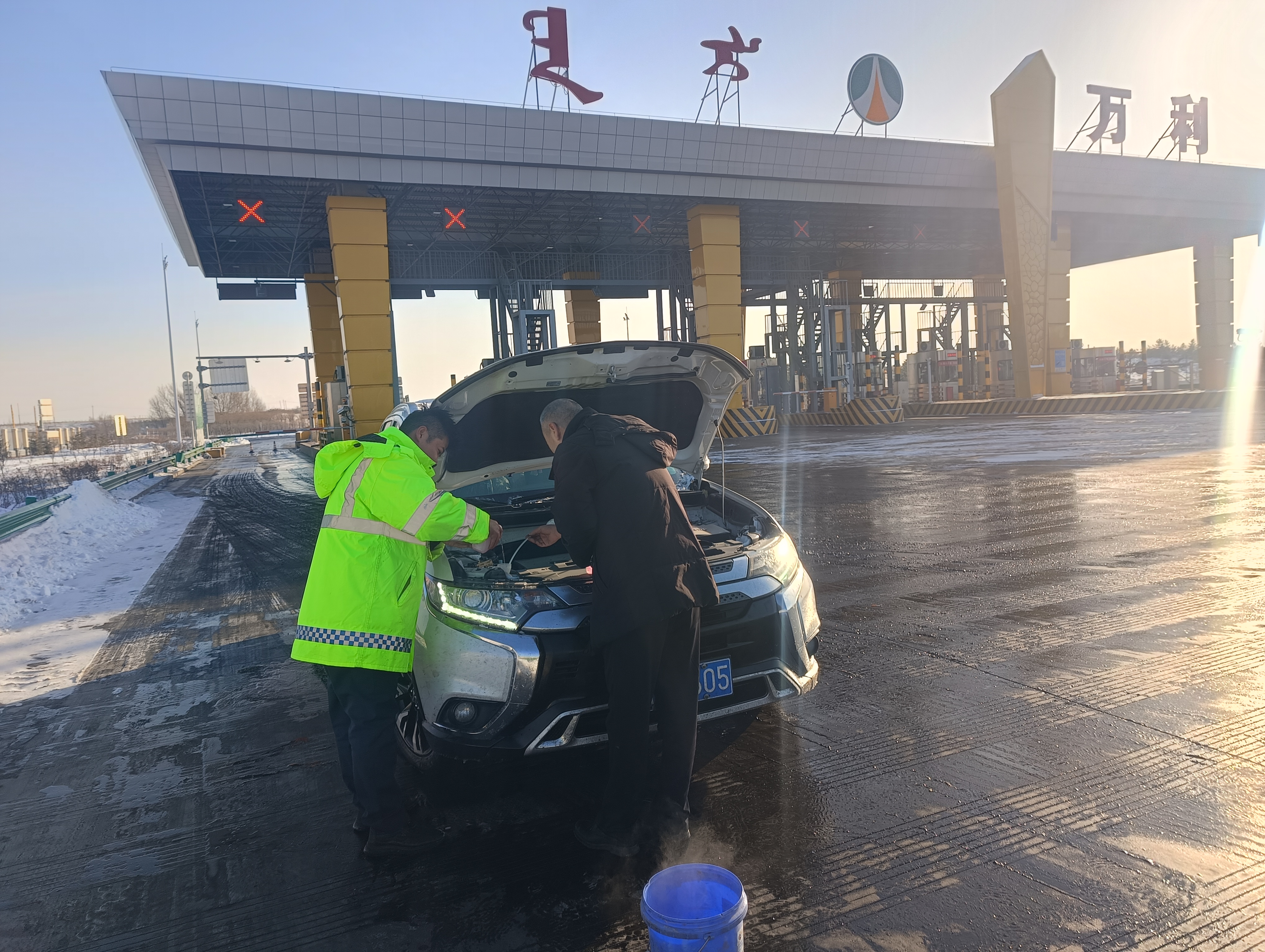 12月20日,一輛轎車停在萬利收費(fèi)所廣場,司乘焦急的在車邊徘徊,當(dāng)班工作人員了解到,因天氣寒冷導(dǎo)致前擋玻璃被冰覆蓋,視線不清存在安全隱患,司機(jī)又冷又急。做好安全布控后,工作人員幫助司乘在玻璃水箱中加入適量溫水,將玻璃水融化后更換成冬季玻璃水,并用專業(yè)工具幫助司乘清除玻璃上的冰,確保車輛可以安全行駛。