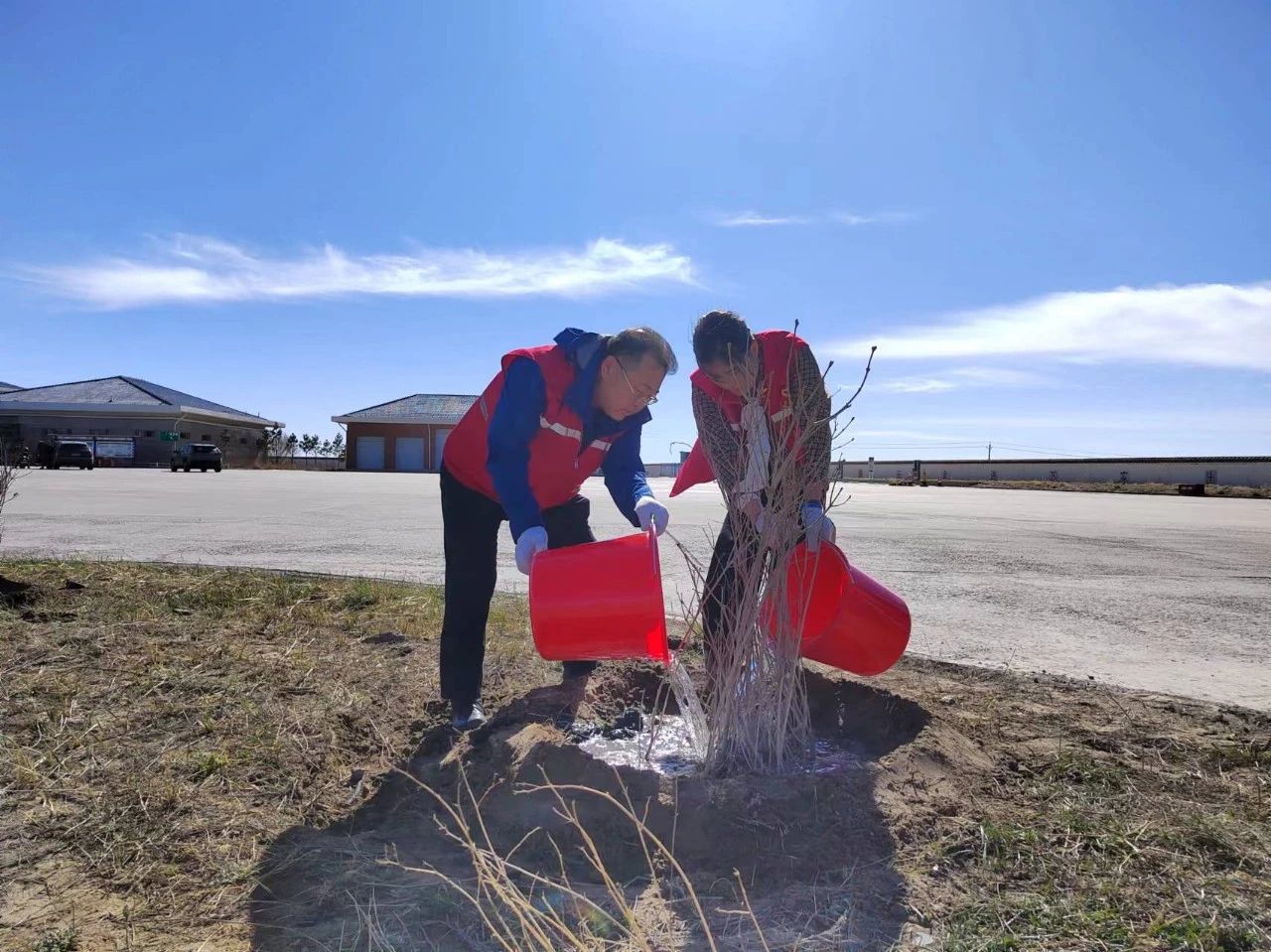 植樹現(xiàn)場,大家積極投身到植樹活動(dòng)中,相互協(xié)作,通力配合,三人成組、五人成隊(duì),揮鋤挖坑、扶苗栽樹、回填沙土、提桶澆水,認(rèn)真完成每一道工序,現(xiàn)場到處呈現(xiàn)出一派熱火朝天的勞動(dòng)景象。經(jīng)過2個(gè)多小時(shí)的共同努力,合力完成1600余株丁香苗木的栽種,一棵棵新栽植丁香苗木扎根土壤,迎風(fēng)挺立,整齊有序,為春天增添了新的生機(jī)。