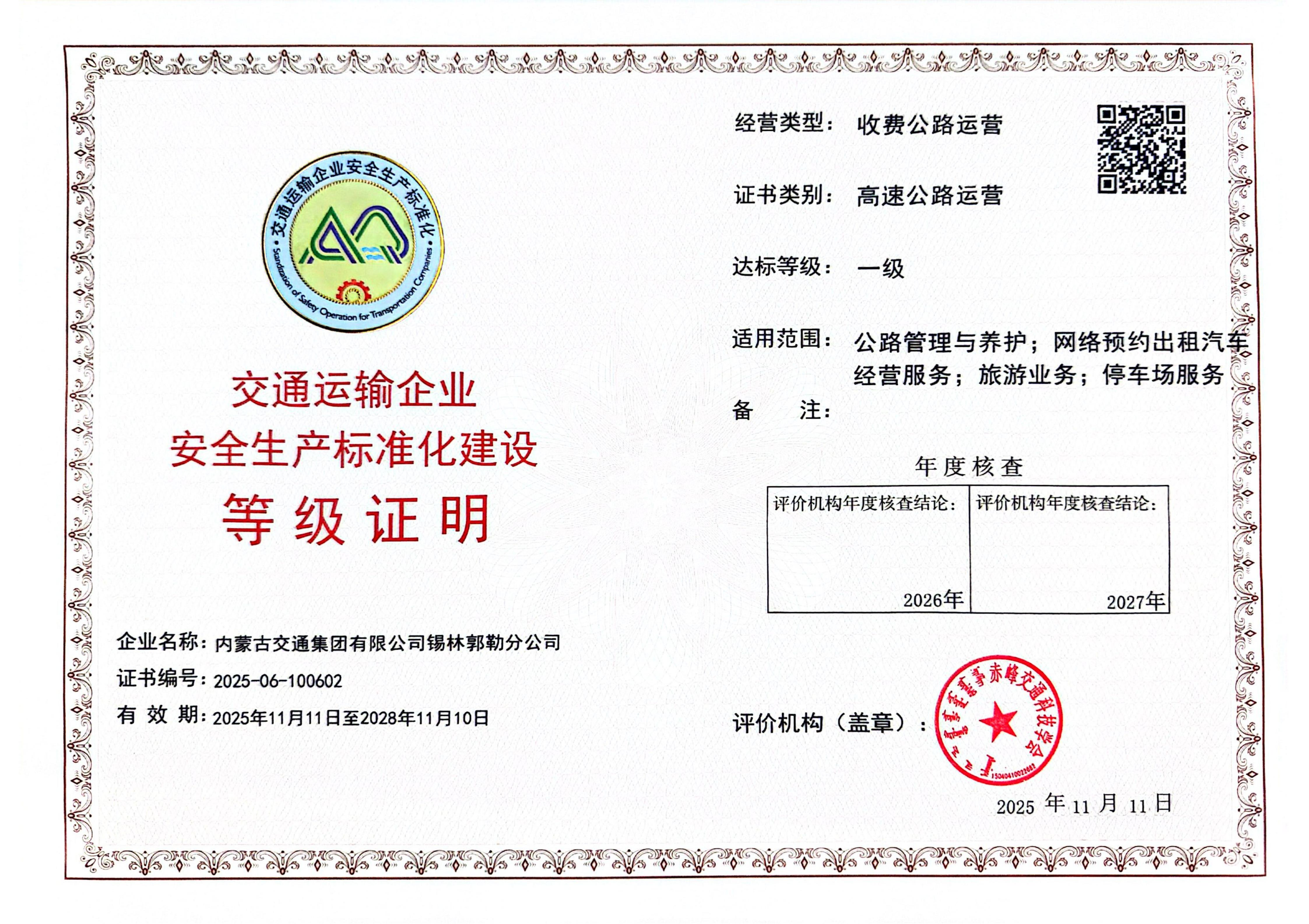11月11日,內(nèi)蒙古交通集團錫林郭勒分公司傳來捷報,歷經(jīng)數(shù)月攻堅,正式通過交通運輸企業(yè)安全生產(chǎn)標準化一級達標評審,成功獲得一級達標證書,標志著分公司在安全生產(chǎn)管理體系建設、風險防控能力及長效機制構建上實現(xiàn)跨越式提升,為分公司安全生產(chǎn)治本攻堅三年行動再添重要成果。