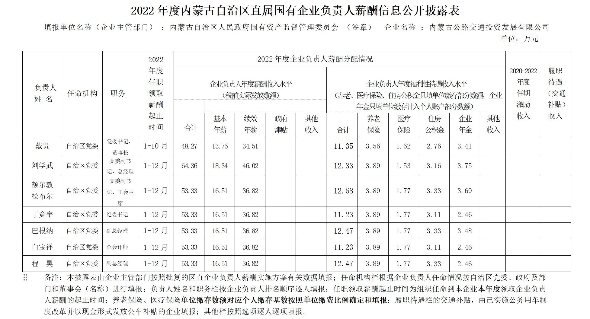 2022年度内蒙古自治区直属国有企业负责人薪酬信息公开披露表