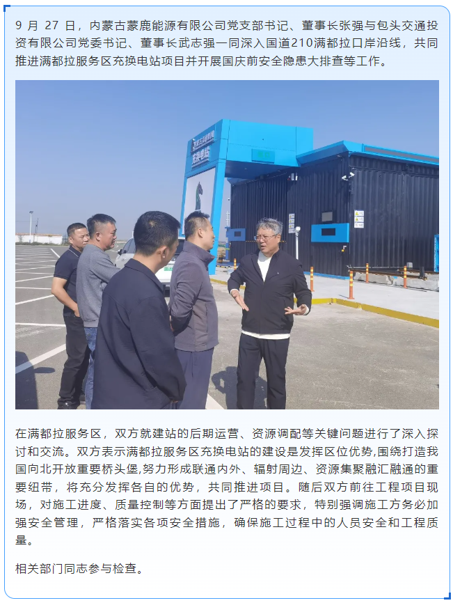 【子公司動(dòng)態(tài)】?jī)?nèi)蒙古蒙鹿能源有限公司與包頭交通投資有限公司攜手推進(jìn)滿都拉服務(wù)區(qū)充換電站項(xiàng)目并開展國(guó)慶前安全隱患大排查