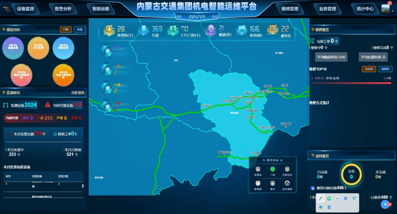 近日,機(jī)電智能運(yùn)維平臺(tái)完成重要升級(jí),呼和浩特收費(fèi)所與呼和浩特東收費(fèi)所成功接入系統(tǒng),率先實(shí)現(xiàn)機(jī)電設(shè)備故障的實(shí)時(shí)監(jiān)測(cè)、上報(bào)與展示,標(biāo)志著收費(fèi)所運(yùn)維管理正式邁入智能化新階段。