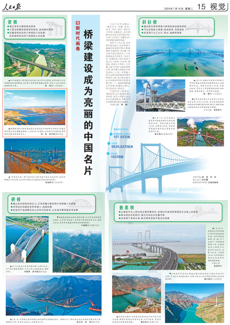 7月16日,《人民日報》以“橋梁建設成為亮麗的中國名片”為題,集中報道了黨的十八大以來我國在橋梁建設方面取得的輝煌成就。報道特別選取了包括武漢長江大橋、深中通道在內的12座標志性橋梁進行展示,由內蒙古交通集團投資建設的昭君黃河特大橋位列其中。