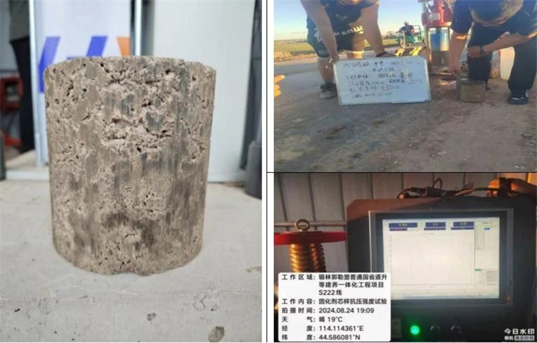 該技術(shù)的核心在于不降低公路設(shè)計(jì)指標(biāo)要求的前提下,利用土壤固化代替部分基層,經(jīng)室內(nèi)試驗(yàn)及現(xiàn)場(chǎng)檢測(cè),土壤拼寬部分的無側(cè)線抗壓強(qiáng)度可達(dá)到8.90兆帕,可完整去除芯樣,滿足設(shè)計(jì)及施工規(guī)范對(duì)基層部分的指標(biāo)要求。