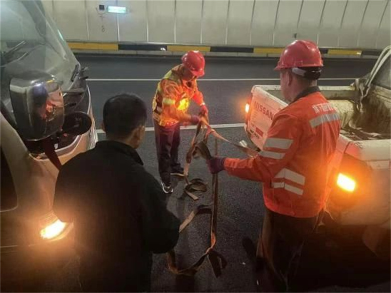 情景二:假期第二日,出行高峰時段,旗下營隧道管理所接到壩底隧道北京方向中巴客車突發(fā)故障停滯的通報。巡路員立刻攜帶救援設備趕赴現(xiàn)場。故障車停在行車道,后方車輛緊急避讓,情況危急。巡路員迅速分工,擺放反光錐筒、警示牌,引導車輛繞行,并與司機溝通。確認車輛無法啟動后,經驗豐富的巡路員指揮使用拖車設備,將故障車平穩(wěn)拖至安全地帶。五一期間,隧道所實行24小時輪班巡查,保障突發(fā)情況及時響應。同時也提醒司乘出行前檢查車況,隧道內遇故障正確應對。