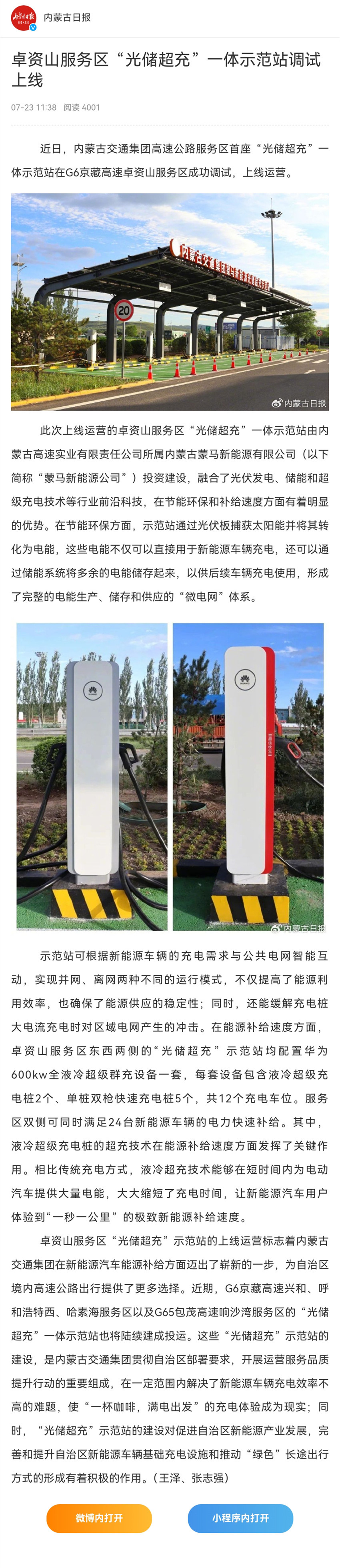 卓資山服務(wù)區(qū)“光儲超充”一體示范站調(diào)試上線