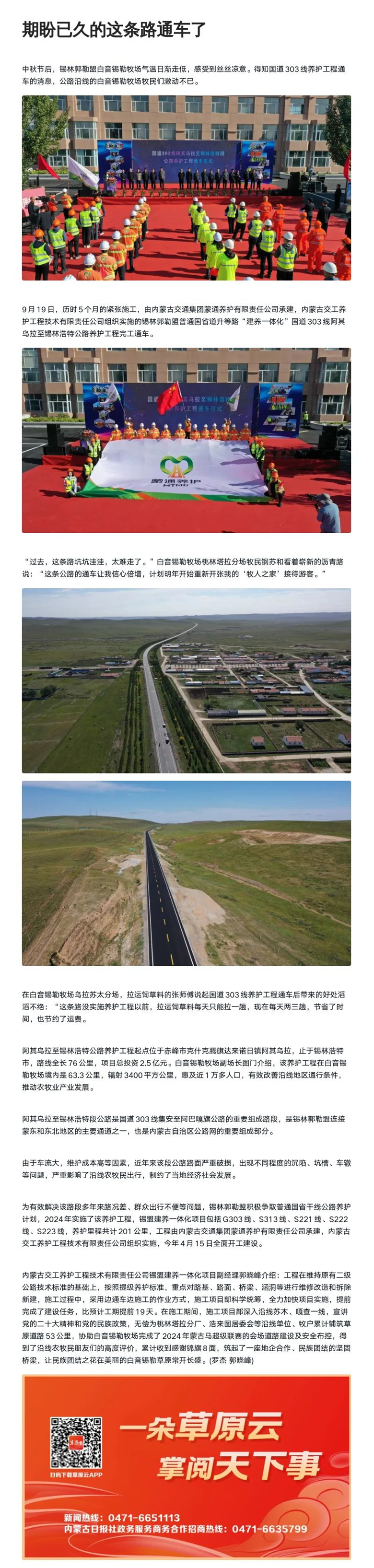 9月19日,經(jīng)過5個(gè)月緊張施工,內(nèi)蒙古交通集團(tuán)蒙通養(yǎng)護(hù)有限責(zé)任公司承建,內(nèi)蒙古交工養(yǎng)護(hù)工程技術(shù)有限責(zé)任公司組織實(shí)施的錫林郭勒盟普通國省道升等路“建養(yǎng)一體化”國道303線阿其烏拉至錫林浩特公路養(yǎng)護(hù)工程提前完工,草原人民期盼的那條路通車了。多家主流媒體對此項(xiàng)工程進(jìn)行了報(bào)道。