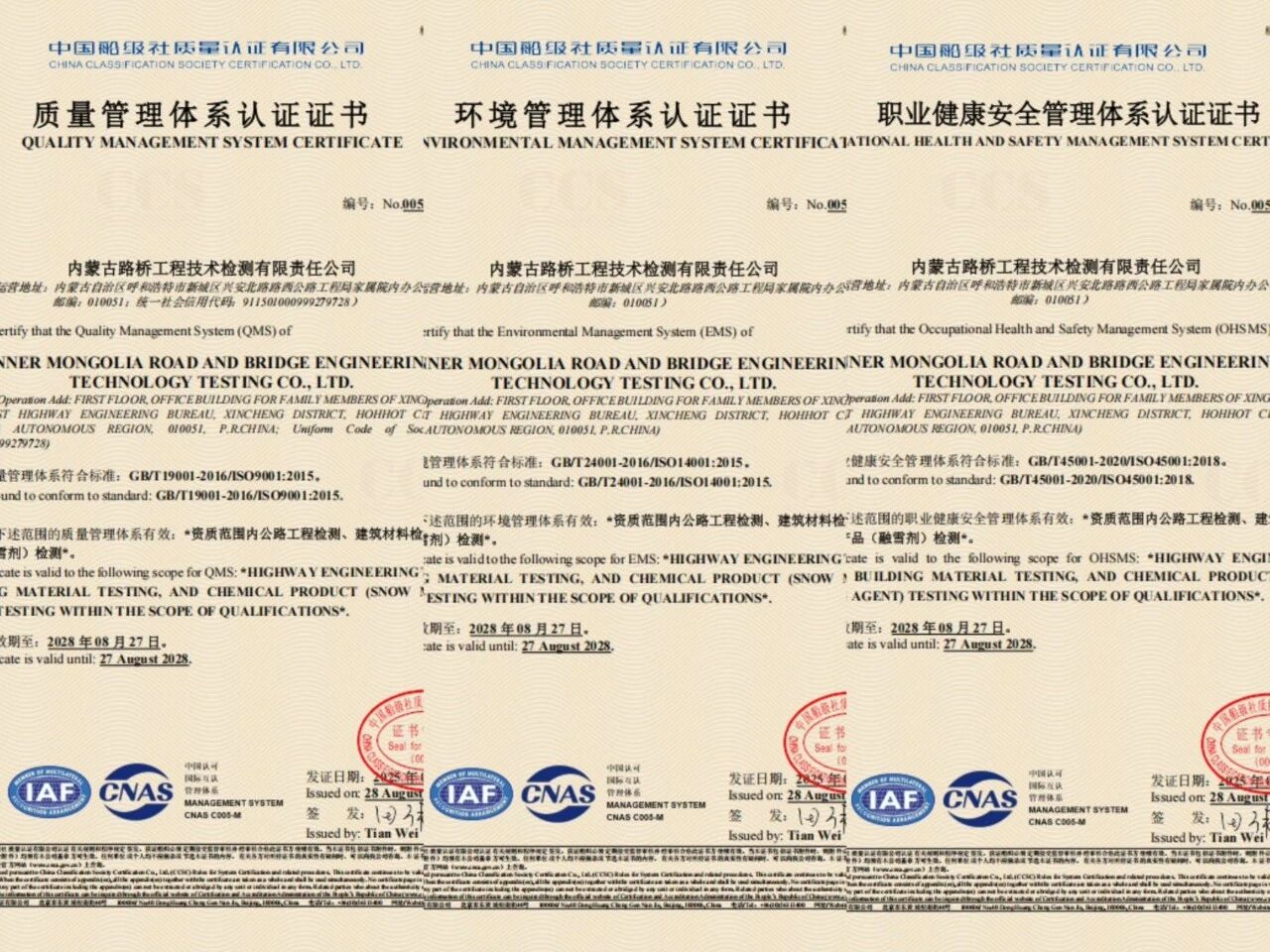 內(nèi)蒙古路橋工程技術(shù)檢測(cè)有限責(zé)任公司成功通過ISO三體系認(rèn)證