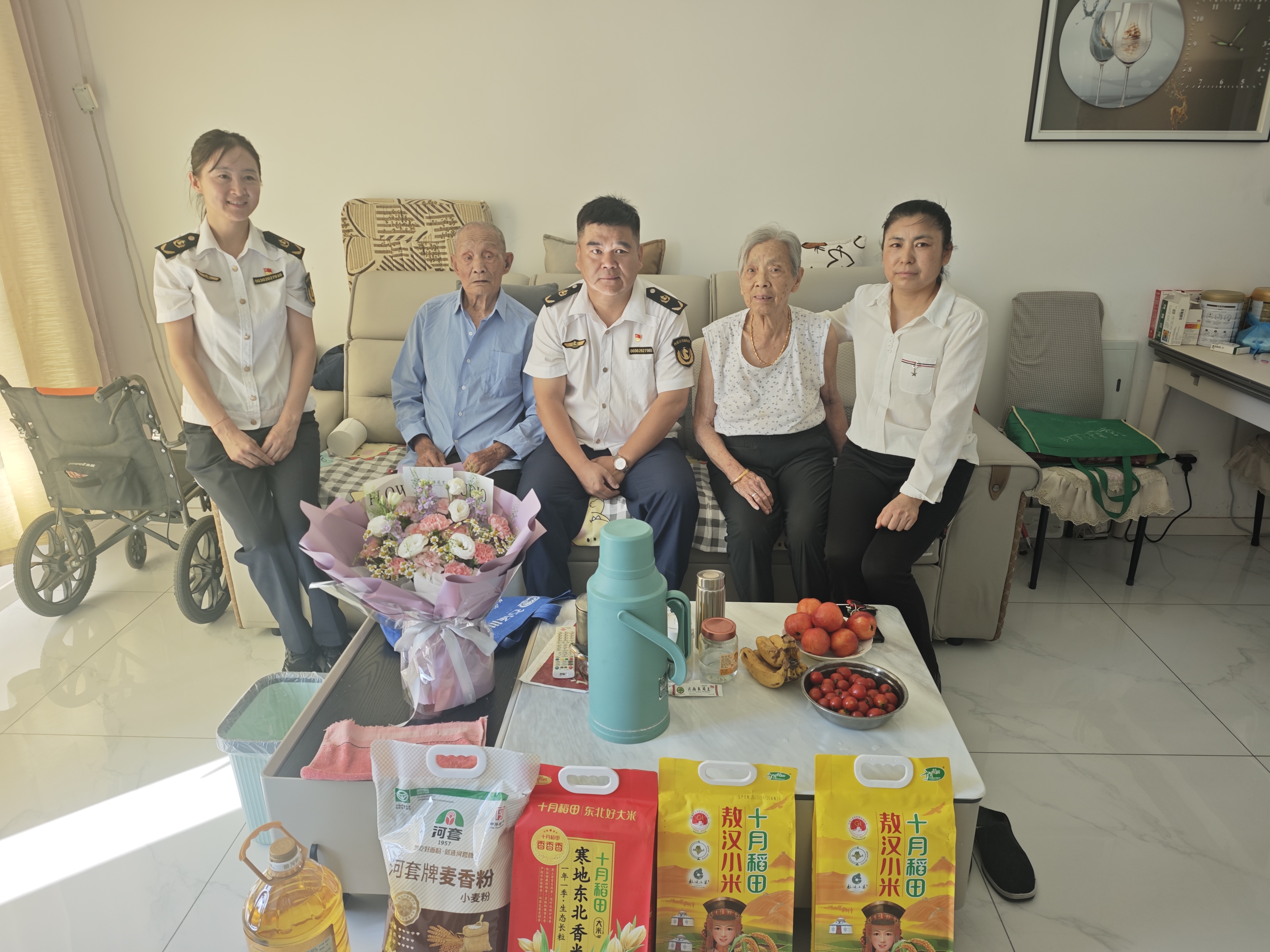 金寶屯收費所黨支部聯(lián)合查日蘇收費所黨支部、巴彥塔拉收費所黨支部、大林收費所黨支部、余糧堡收費所黨支部、遼河收費所黨支部,共同來到團結(jié)社區(qū)94歲抗美援朝老兵王慶林家。與老兵親切交談,詳細詢問老兵的身體狀況、生活情況以及實際需求,為其送上了精心準(zhǔn)備的慰問品,包括米、面、油、小家電等生活用品,向其致以節(jié)日的誠摯問候和崇高敬意,感謝他為國家和人民所作出的貢獻。