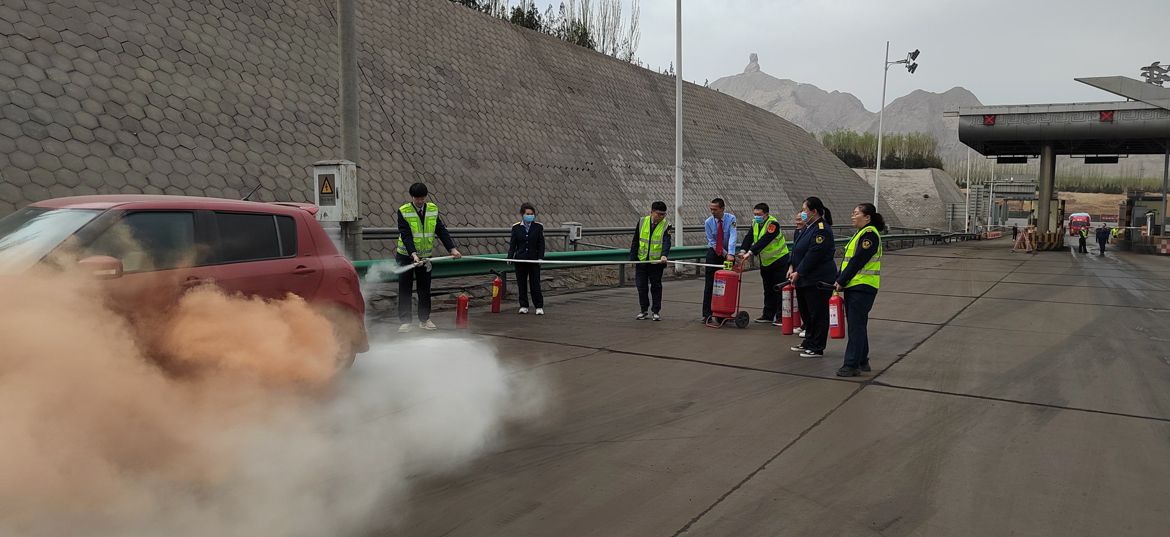 地處內蒙古自治區(qū)西部的烏海市海勃灣區(qū)眼下正是大風多、天干物燥 、易起火的季節(jié)。為應對收費站車輛突發(fā)著火交通安全事故,提升高速員工的消防安全意識和應急處置能力,保障過往車輛和乘客的安全,避免造成高速公路交通堵塞,4月8日上午,內蒙交通集團烏海分公司海勃灣收費所組織開展了模擬小型客車在收費車道突發(fā)自燃應急演練實戰(zhàn)活動。