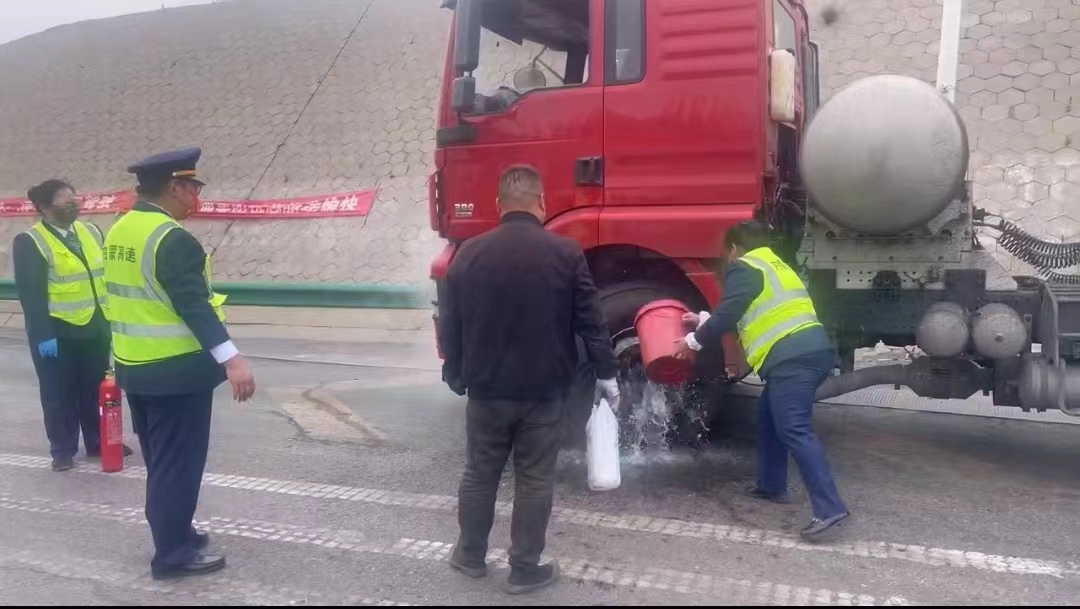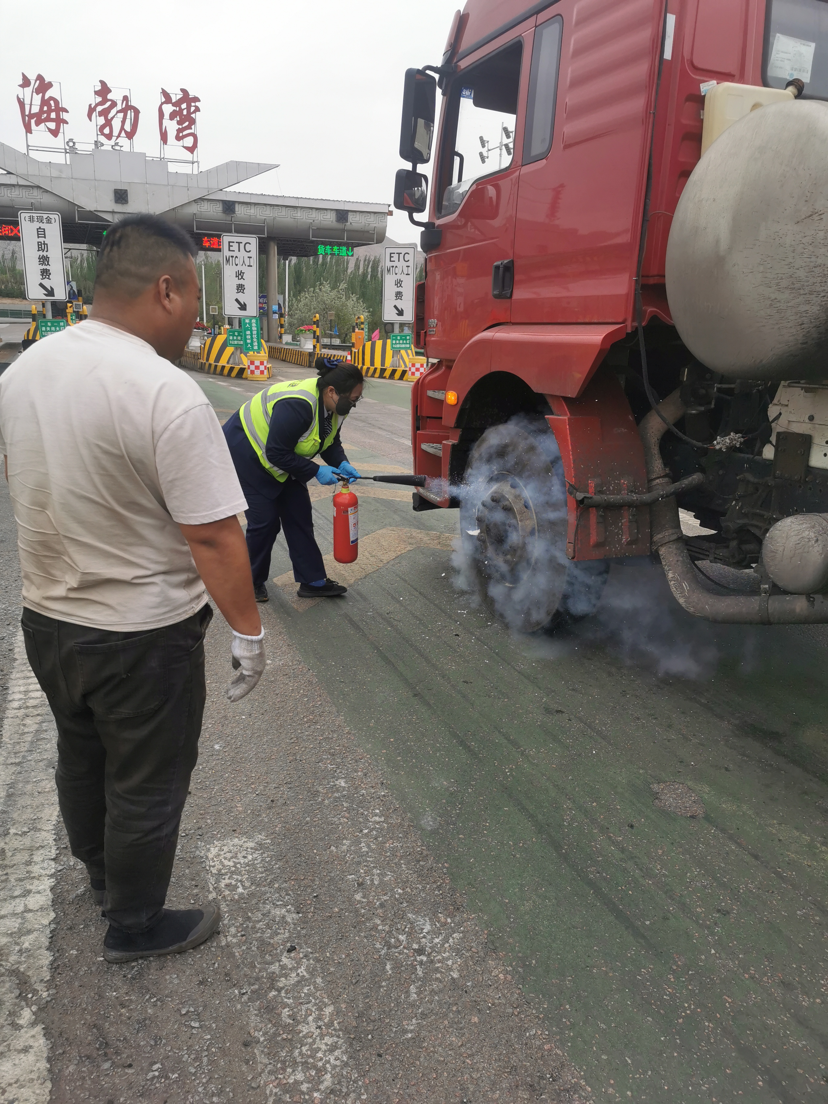 事情的經(jīng)過是這樣的: 2024年5月4日中午11點30分,司機師傅駕駛一輛六軸大貨車在海勃灣收費所正準備下站時,駕駛艙下輪胎處冒著滾滾濃煙并夾雜著刺鼻的焦糊味,車軸里燃燒著熊熊火焰,情況十分危急,引起了出口收費員的警覺?!鞍嚅L,計重車道的這輛貨車輪胎著火啦!” 收費員使用對講機急呼收費班長。海勃灣收費所迅速啟動應(yīng)急預(yù)案。該收費員火速抬桿放行,指揮著火車輛迅速通過收費車道,并將其快速引導(dǎo)到外廣場空曠區(qū)域,其他當班人員快速拿起收費現(xiàn)場滅火器跑向著火車輛,對著火點進行滅火,控制火勢,同時將被困大車司機從駕駛艙救出。