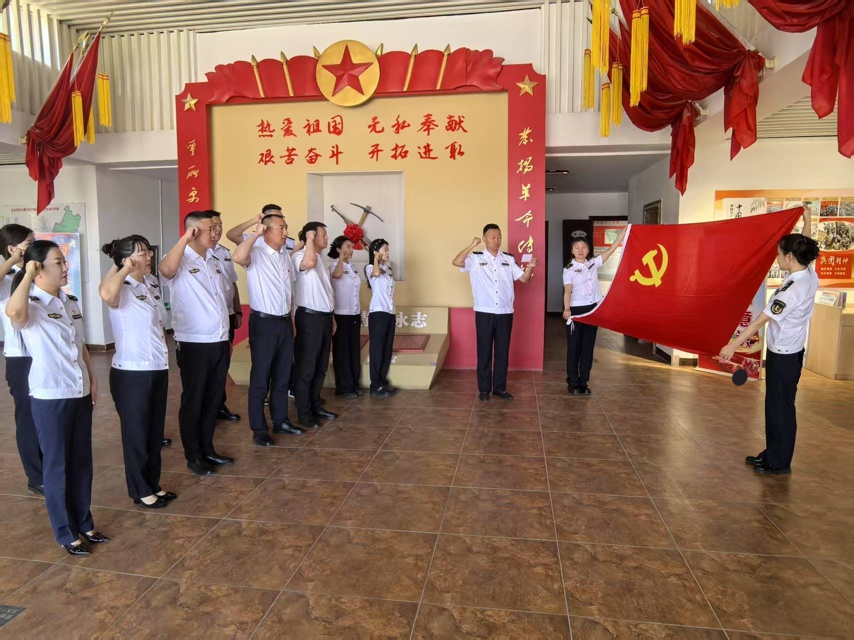 追憶歷史,傳承精神汲取力量。組織黨員們參觀了內(nèi)蒙古兵團(tuán)博物館。在講解員的引導(dǎo)下,博物館內(nèi)詳實(shí)的史料、珍貴的文物和生動(dòng)的場(chǎng)景再現(xiàn),將黨員們帶回了那段激情燃燒的歲月。黨員們凝視著泛黃的老照片、陳舊的生產(chǎn)工具、兵團(tuán)戰(zhàn)士的日記手稿等展品,深刻感受到了兵團(tuán)戰(zhàn)士們“熱愛祖國、無私奉獻(xiàn)、艱苦奮斗、開拓進(jìn)取”的兵團(tuán)精神,也被老一輩革命者和建設(shè)者們戰(zhàn)天斗地、改天換貌的英雄事跡深深打動(dòng)。