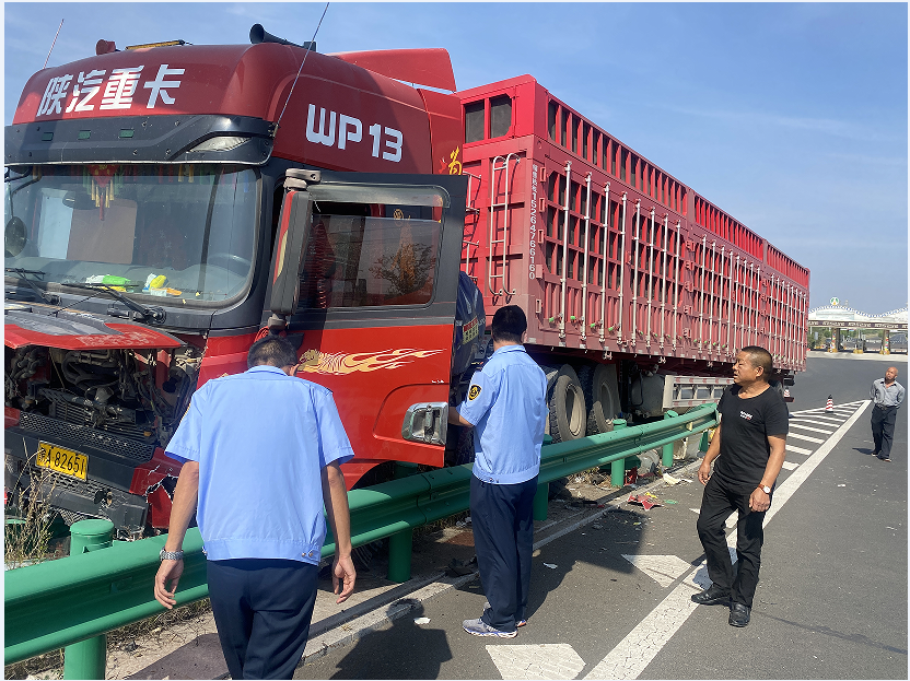 2023年9月14日10點28分,一輛車牌號為蒙A82651貨車在行駛至集寧東收費所環(huán)島道路分叉口時,與隔離帶發(fā)生碰撞,車輛受損變形嚴重。