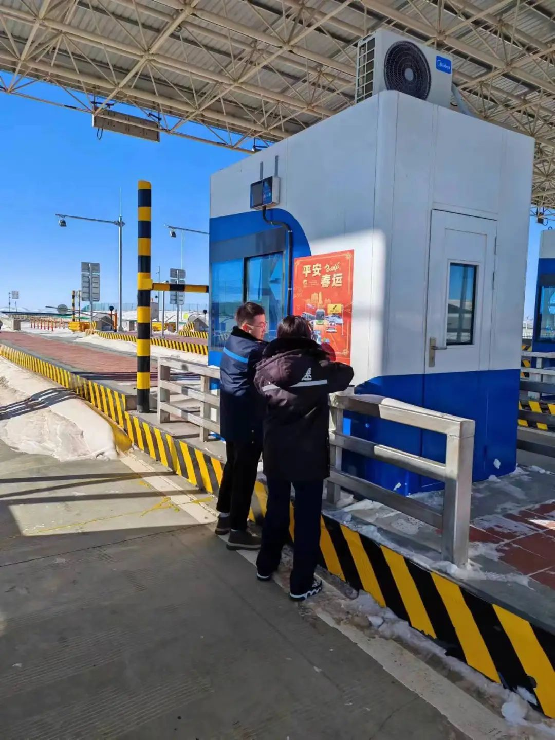 巴音塔拉收費所針對春運期間可能會有的惡劣天氣制定了專項應(yīng)急預(yù)案,積極與指揮中心和養(yǎng)護(hù)工區(qū)聯(lián)系,確保有惡劣天氣做到早預(yù)報、早部署、早采取預(yù)防處置措施。做到以雪為令、隨下隨掃、確保過往司乘行車安全。還利用收費廣場張貼春運宣傳畫報,提醒過路司乘春運期間遵守道路交通法律法規(guī),安全駕駛、文明出行。同時,對收費區(qū)域、辦公區(qū)域、食堂等地的設(shè)施設(shè)備進(jìn)行全面檢查,確保正常運行。并且在收費亭設(shè)立便民服務(wù)亭,為過往司乘24小時提供熱水、應(yīng)急藥物以及其他便民服務(wù)項目。盡最大的努力為過往司乘人員排憂解難,營造“平安出行、溫暖同行”的良好氛圍。