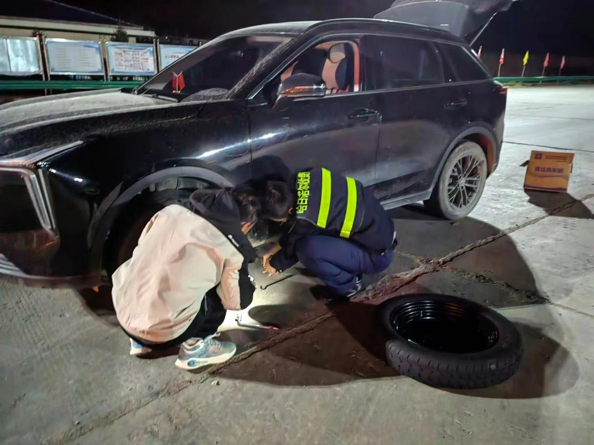 10月14日凌晨,一輛黑色越野車因輪胎扎釘無法行駛,向哈日諾爾收費所工作人員進行求助。得知情況后,工作人員一邊安撫司機情緒,一邊將車輛引導至安全區(qū)域,同時拿來修車工具箱,幫助司機更換備用輪胎。看到換好的輪胎,司機拿出身上的現(xiàn)金以表謝意。然而,工作人員連連擺手,謝絕了這份心意,并叮囑他注意安全,備胎無法高速行駛,一定要把輪胎修好。同日,突泉收費所工作人員及時開展便民服務工作,獲得司機點贊。