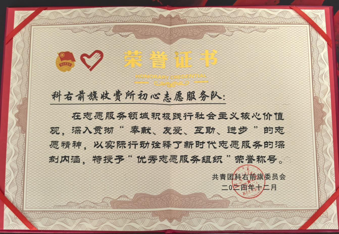 近日,共青團科右前旗委員會授予前旗收費所“初心”志愿服務隊“科右前旗優(yōu)秀志愿服務組織”榮譽稱號。據悉,“初心”志愿服務隊積極踐行“奉獻、友愛、互助、進步”的志愿精神,開展了敬老、扶貧、助殘、助學、環(huán)保等形式多樣的志愿服務活動,始終用暖心繪就志愿服務最溫暖底色。