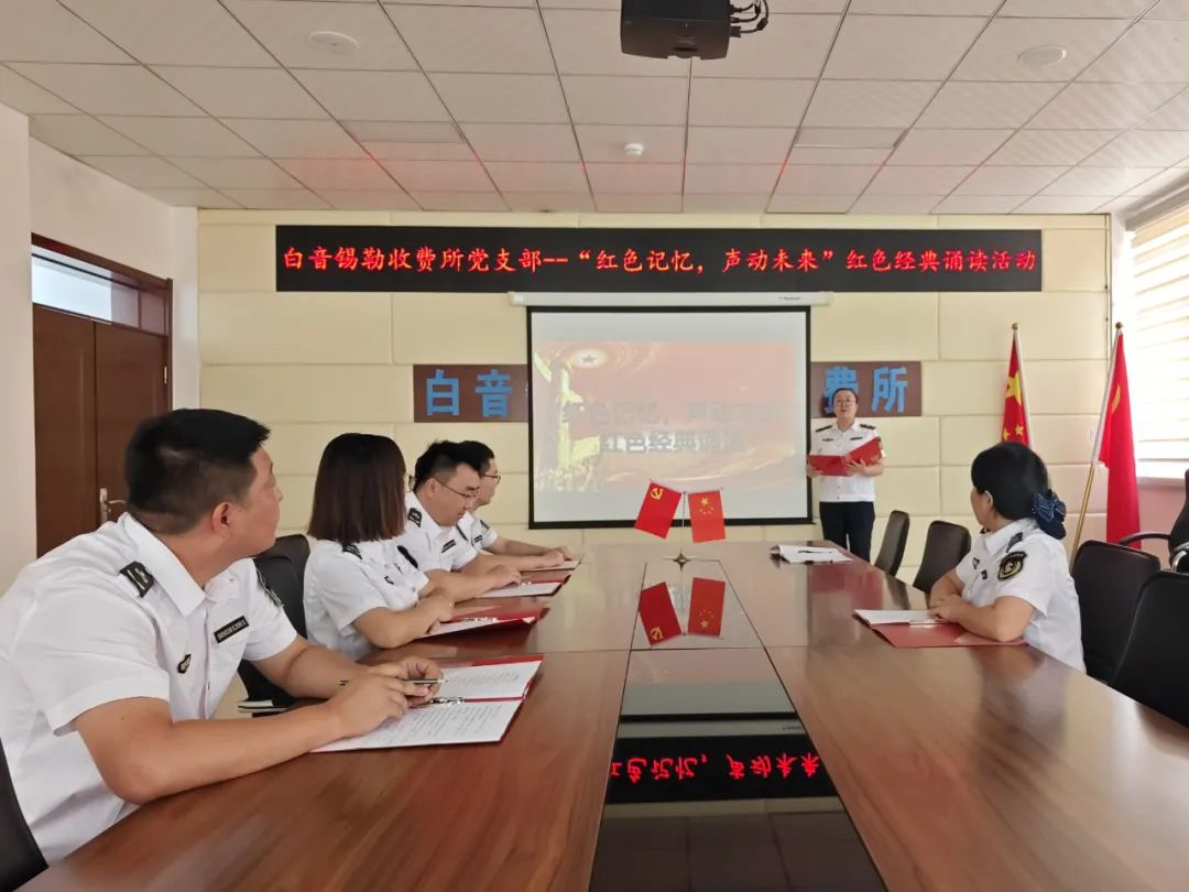 6月30日,白音錫勒收費(fèi)所黨支部組織開展“紅色記憶·聲動(dòng)未來(lái)”紅色經(jīng)典誦讀活動(dòng)?;顒?dòng)中,大家選取《紅船,從南湖起航》《面對(duì)鮮紅的黨旗》等著作部分章節(jié)內(nèi)容,一個(gè)個(gè)經(jīng)典的黨史故事,再一次教育引導(dǎo)黨員干部職工堅(jiān)定感黨恩、聽黨話、跟黨走的信心和決心。
