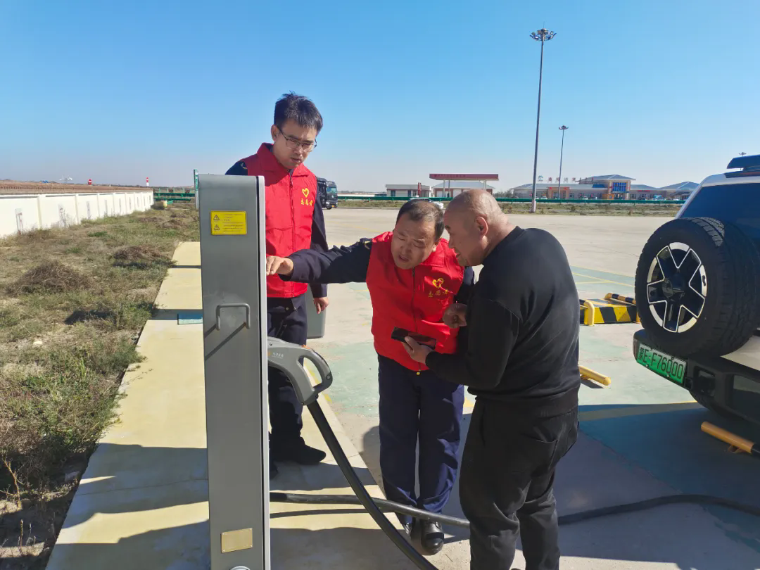 桑根達(dá)來服務(wù)區(qū)工作人員在服務(wù)區(qū)廣場(chǎng),耐心、細(xì)致地為過往的司乘人員提供充電指引服務(wù)。