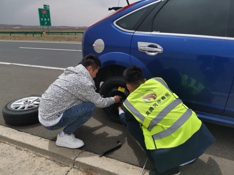了解完情況后,灰騰河收費所立即派車跟隨車主到達車輛所在地,在其后方設置了錐形桶和警示三腳架,警示提醒后方經(jīng)過車輛,并從車后備箱拿出千斤頂?shù)裙ぞ?,幫助車主更換輪胎,十幾分鐘后終于將備胎換好。臨走時司機緊緊地握住了收費員的雙手連聲道謝:“多虧有你們的幫忙,要不然還不知道要多長時間才能解決問題,真的太感謝你們了!”收費員張浩宇邊擦額頭上的汗邊笑著說道:“不客氣,為司乘人員排憂解難是我們應該做的?!?/p>