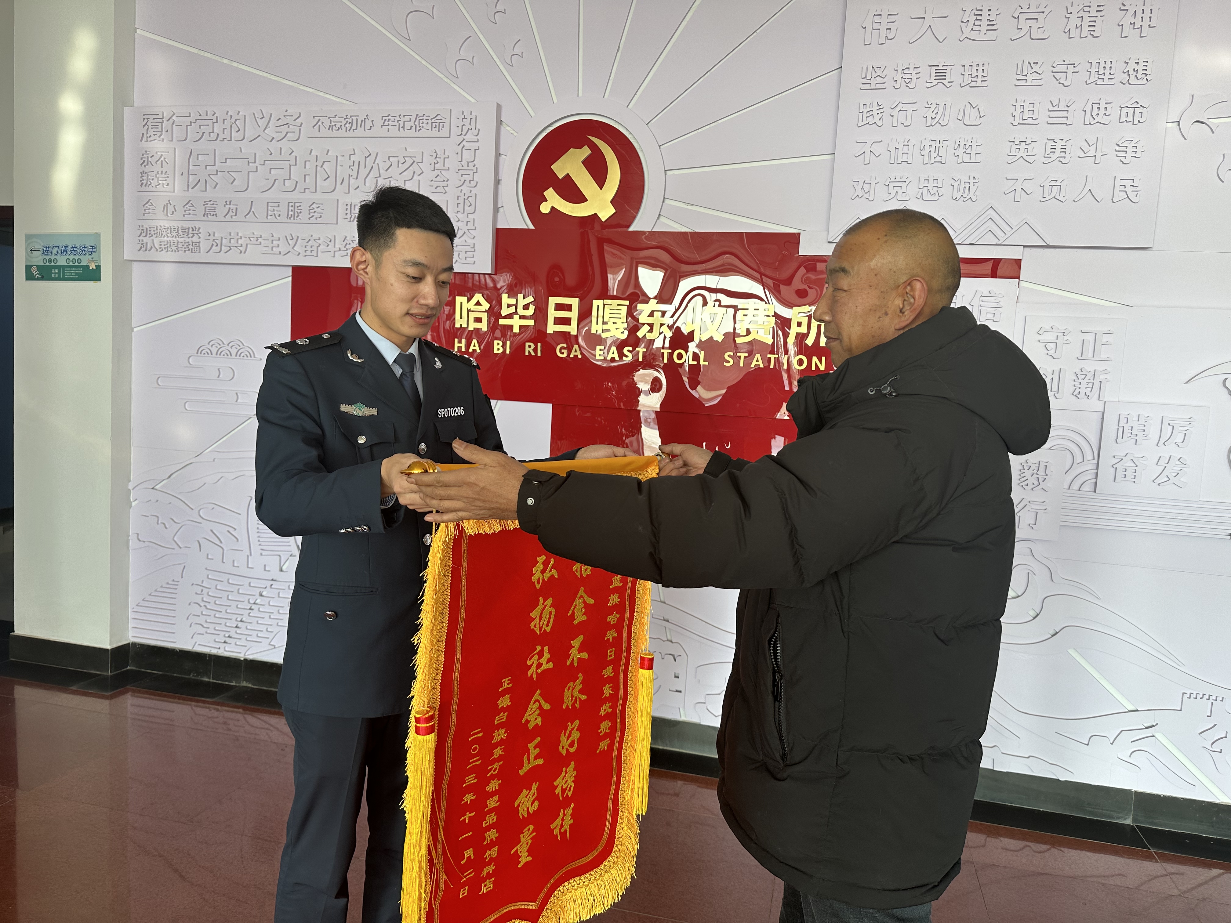 近日,哈畢日嘎鎮(zhèn)社區(qū)主任將一面繡有“拾金不昧好榜樣 弘揚社會正能量”的錦旗送到哈畢日嘎東收費所。事情回顧到2023年11月初,哈畢日嘎東收費所收費員夜班巡查時,發(fā)現(xiàn)路面上散落著20多袋飼料,收費所工作人員經(jīng)多方了解,最終通過哈畢日嘎鎮(zhèn)社區(qū)聯(lián)系到失主,并將其歸還,充分彰顯了交通人拾金不昧的良好品德。