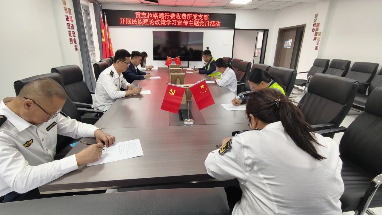 寶力根陶海收費所組織職工在收費廣場向過往車主發(fā)放民族理論政策知識宣傳單,宣傳民族團(tuán)結(jié)進(jìn)步理念,以通俗易懂的方式讓車主們深入了解黨的民族理論知識,引導(dǎo)群眾牢固樹立“四個與共”共同體理念、不斷增強(qiáng)“五個認(rèn)同”。