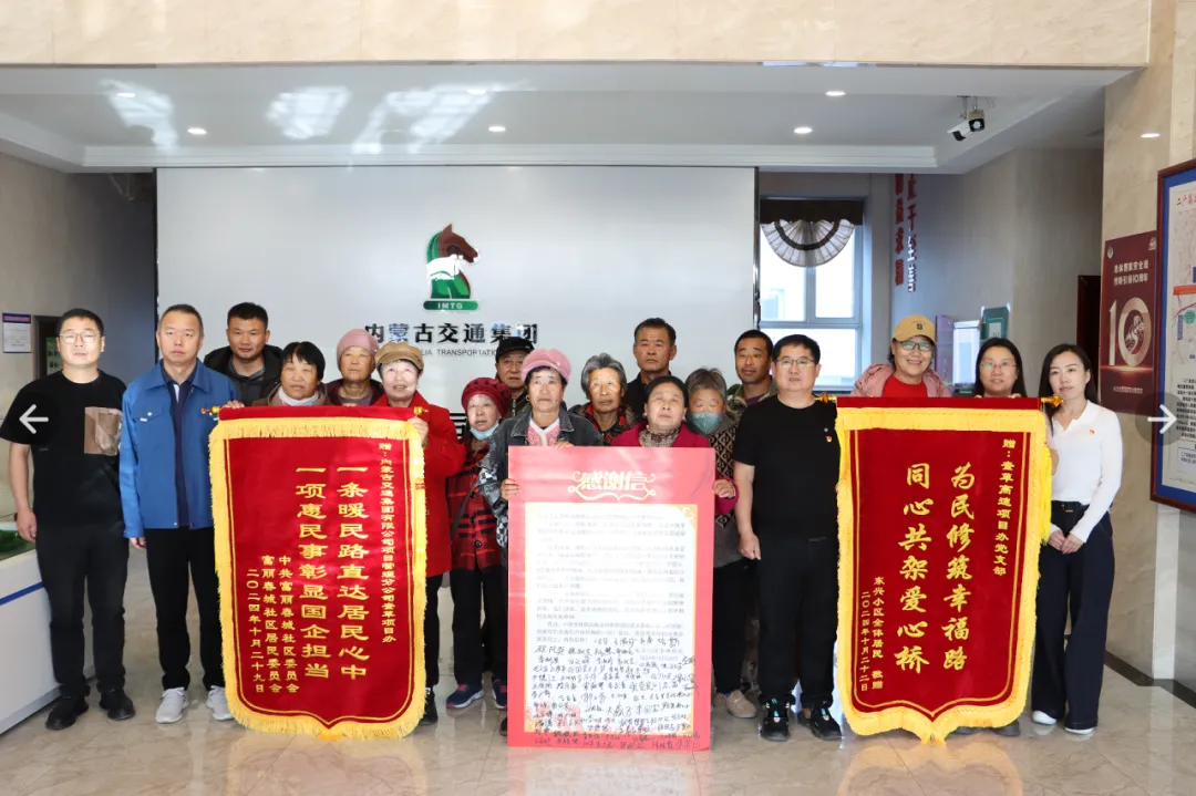 11月2日,扎魯特旗富麗春城社區(qū)干部和居民帶著承載謝意的錦旗和感謝信來(lái)到內(nèi)蒙古交通集團(tuán)有限公司項(xiàng)目管理分公司查草項(xiàng)目辦,感謝項(xiàng)目辦黨組織為群眾辦實(shí)事,修建了一條寬敞的出行路,解決困擾居民多年的出行難問(wèn)題。