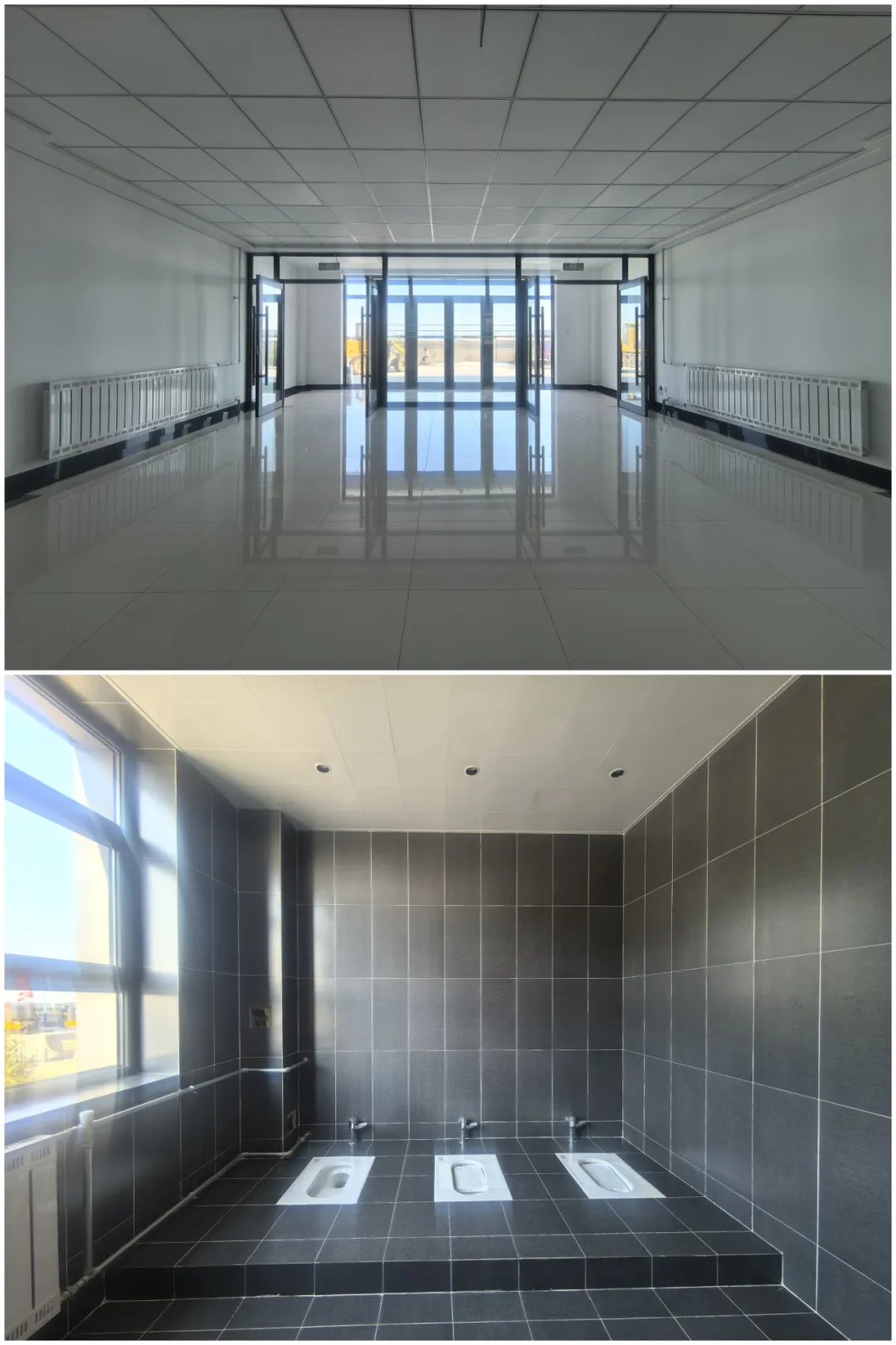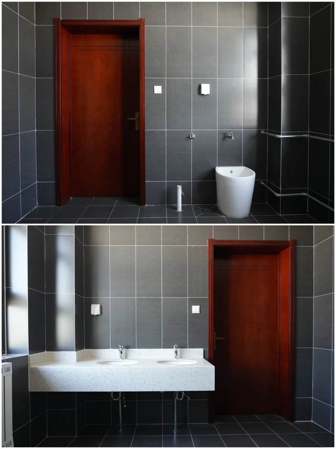 混凝土結構內實外光,棱角分明精準;管線穿墻位置標高精確,封堵嚴密美觀。室內裝飾追求極致,墻地面平整如鏡,各類材料拼縫嚴密、天地通縫、收口精細,邊角無瑕,門窗五金嚴絲合縫。建筑外觀經BIM精密排版,外墻陶瓷板排列嚴整,橫縫交圈、縱縫貫通對齊,縫寬均勻。細部處理同樣考究:地漏精準定位排水暢,滴水線清晰有效防倒流,檢修口隱蔽實用。