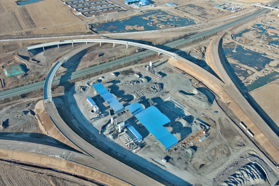 永臨結(jié)合,全周期降本增效,項目踐行“以臨促永、永臨結(jié)合”理念,實現(xiàn)資源高效集約,將瀝青站、水穩(wěn)站及預(yù)制梁場直接設(shè)置在互通立交的A、C匝道永久占地范圍內(nèi),大幅減少臨時用地及復(fù)墾壓力,縮短運距降碳提速。